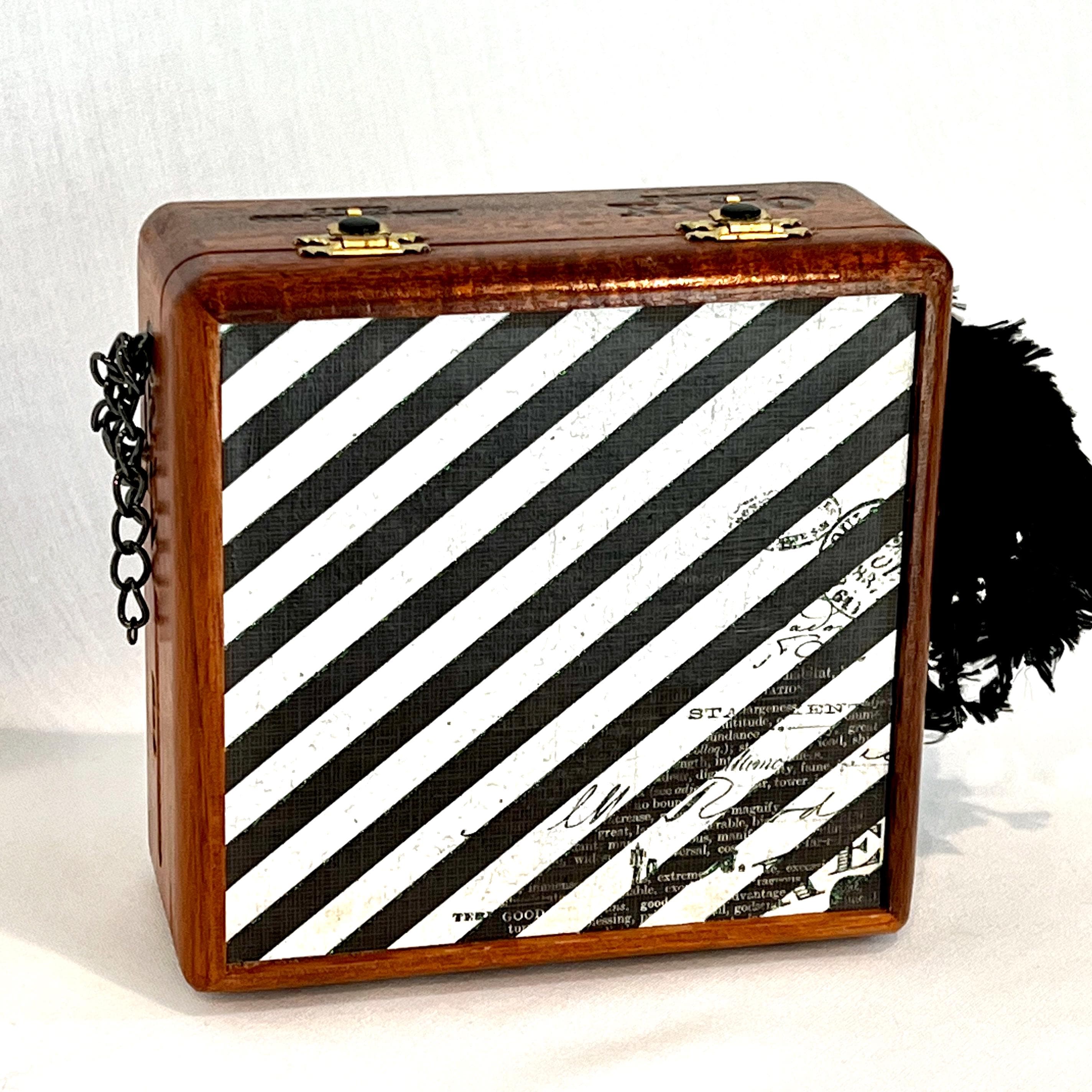 This one-of-a-kind cigar box purse makes a bold statement! From the diagonal black and white stripes to the layered double chain and crystal handle, this handbag is all about the details.