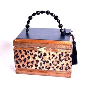 This bold animal print purse was upcycled from Napa Cigar Society box. A glossy zebra pattern covers one side, while the other is solid black. The hip bag features a silver tone chain that can be worn over the shoulder or carried in hand. It's the perfect accessory to liven up a simple jeans and t-shirt outfit, or a little black dress!