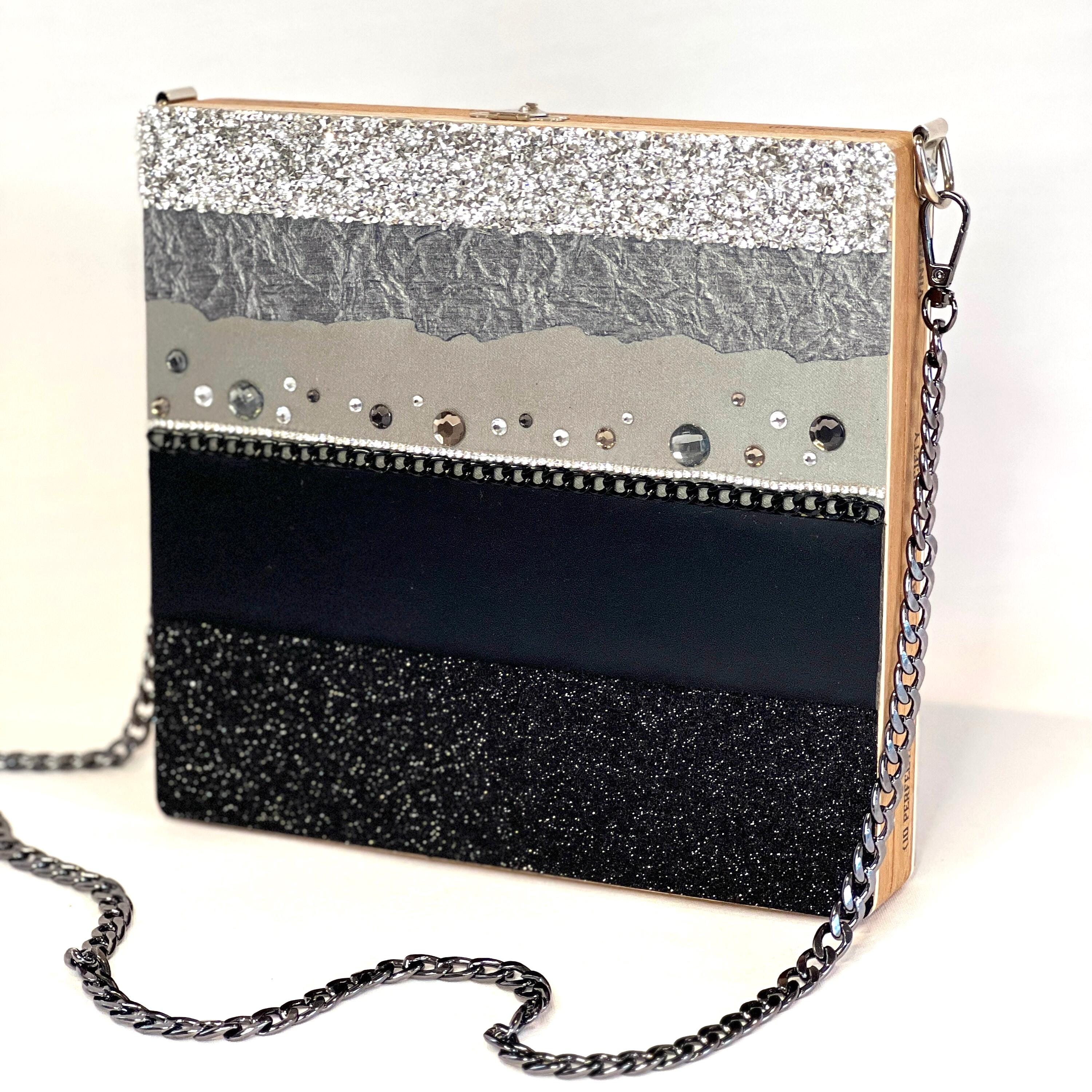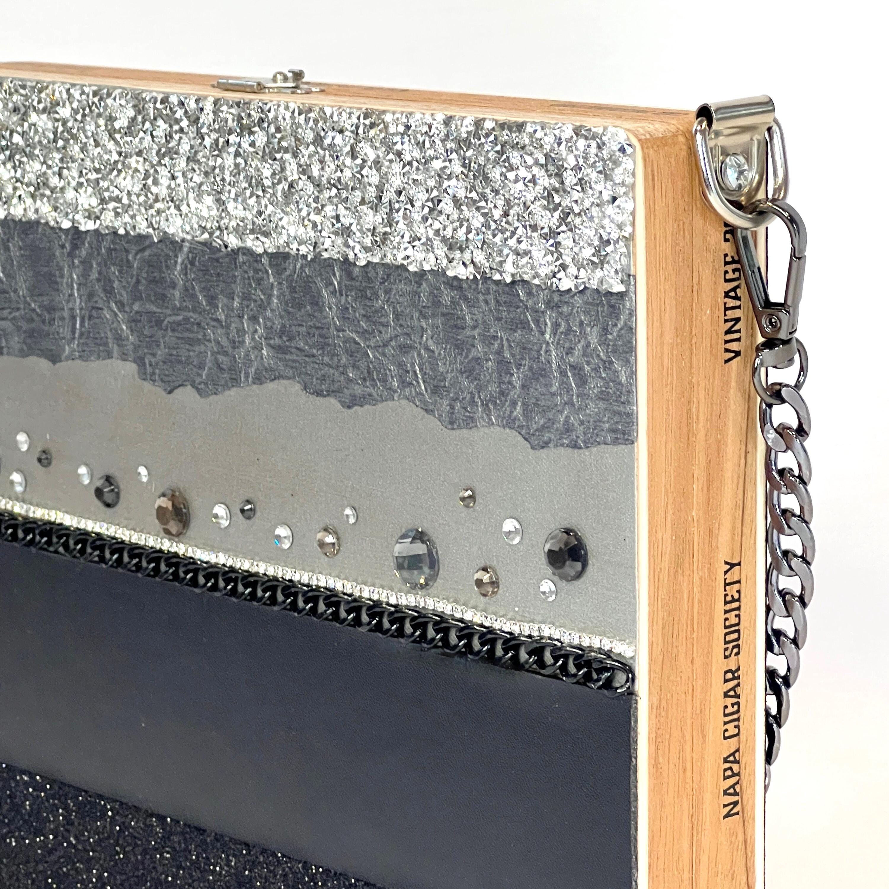 This embellished cigar box purse is layered with bling with a rock star vibe! It features bands of black faux leather, glitter, chain, rhinestones and silver textured papers on one side, while the other is covered in solid black glitter.