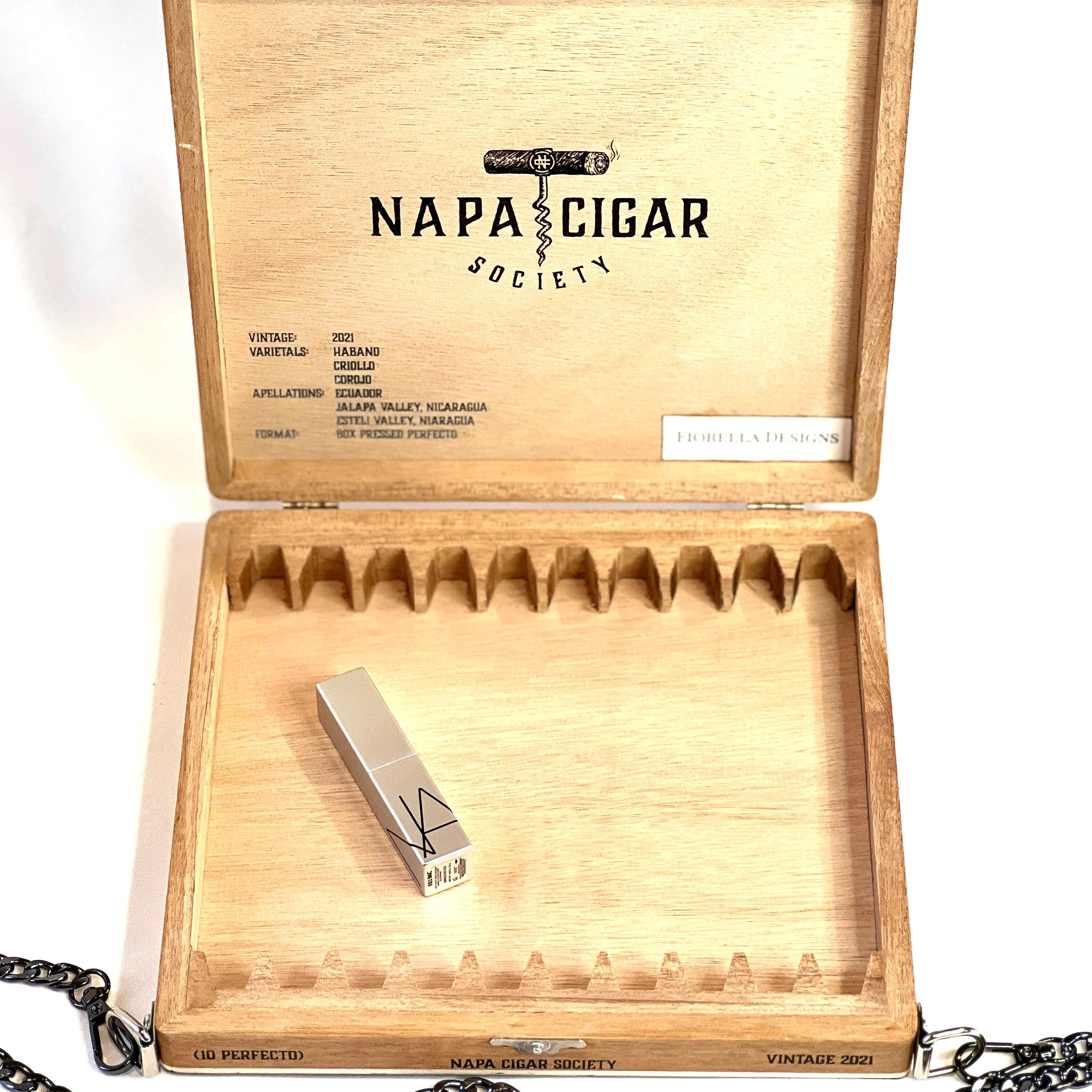 The light wood of the original Napa Cigar Society box contrasts with the bold ombre effect on the purse. A 36 inch chain shoulder strap in a gunmetal tone finishes off the edgy look.