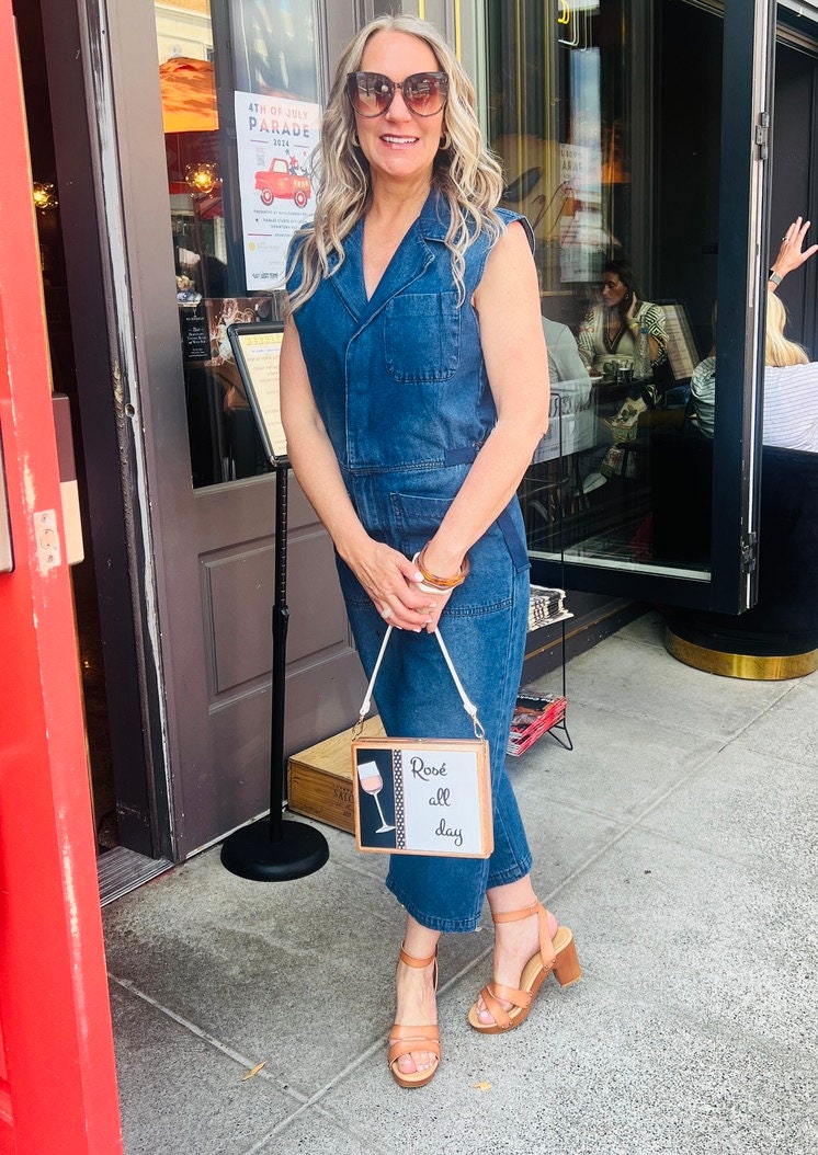 This cute cigar box handbag is perfect for the Rosé wine lover! A black and white color scheme is accented with a glass of pink wine and the phrase "Rosé All Day" spelled out in cursive text. The coordinating side is covered in a polka dot print, and a white vegan leather strap is the finishing touch. Carry on a day of wine tasting, a girl's weekend or party!