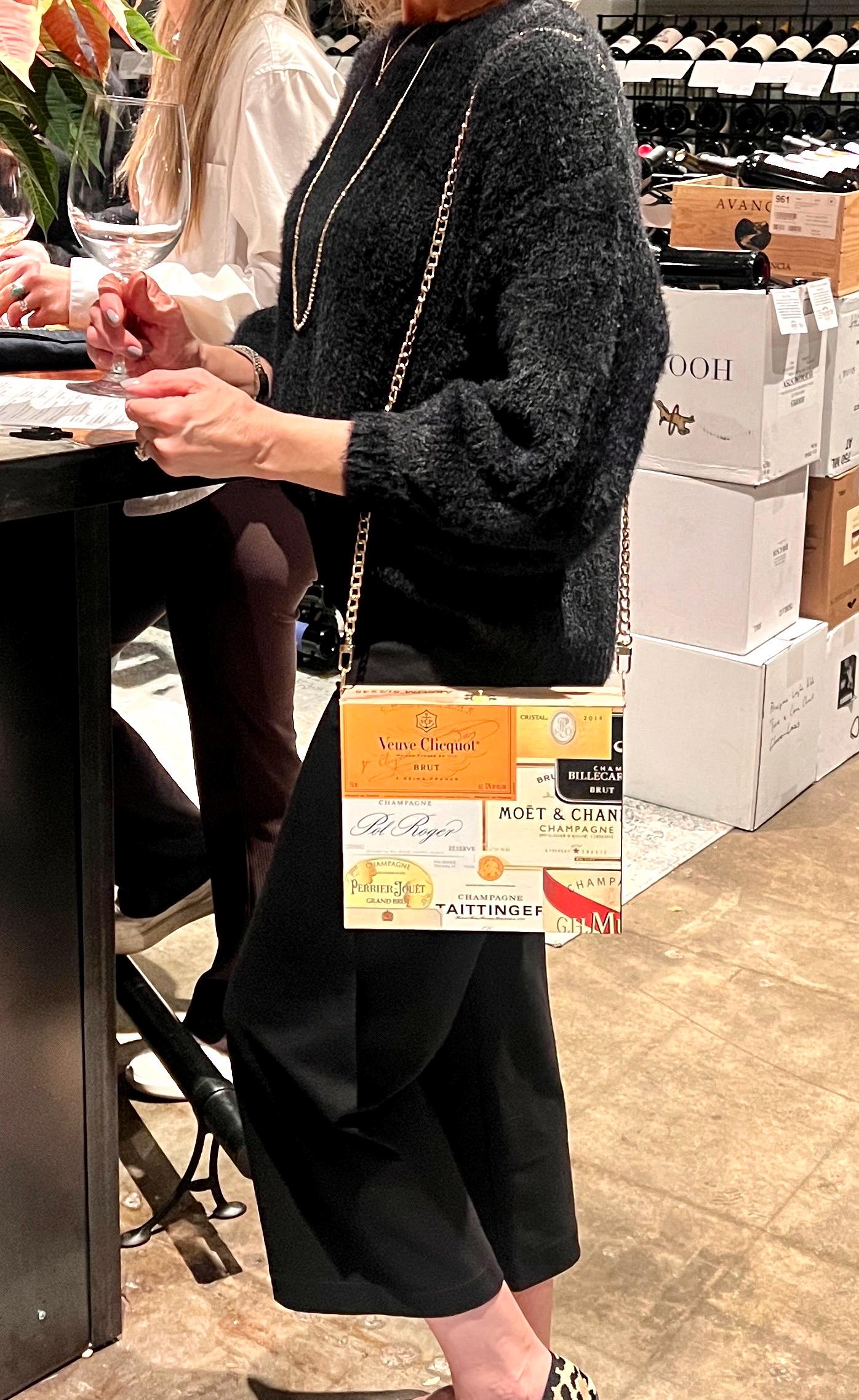 This original wood cigar box has been upcycled into a statement Champagne themed purse! An image of layered luxury Champagne labels covers one side, including Veuve Clicquot, Moet and Cristal. The other is decoupaged with a simple black paper. The natural light tone wood contrasts with the rich colors of the labels.