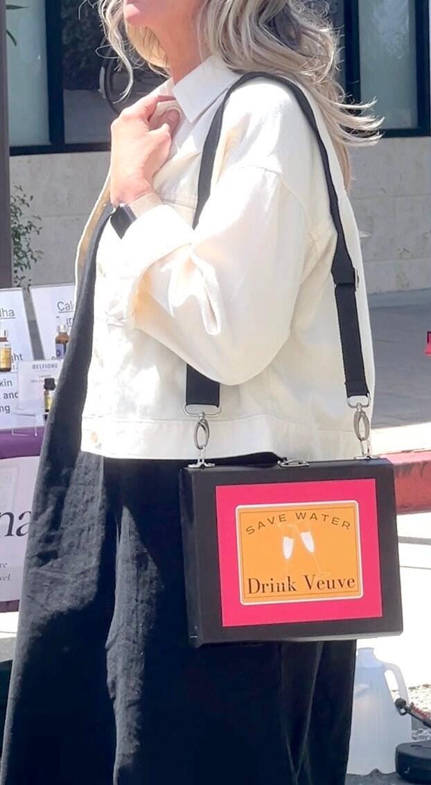 Be the life of the party with this Veuve Clicquot inspired purse! The black wood cigar box has been upcycled with Champagne label art of my own design. "Save Water Drink Champagne" is printed on the front, along with a set of glasses of bubbly. The hot pink background pops against the yellow orange, while the other side is covered in black glitter. Whether it's a birthday celebration, a girl's weekend or a bachelorette party, this handbag is the perfect accessory to carry!