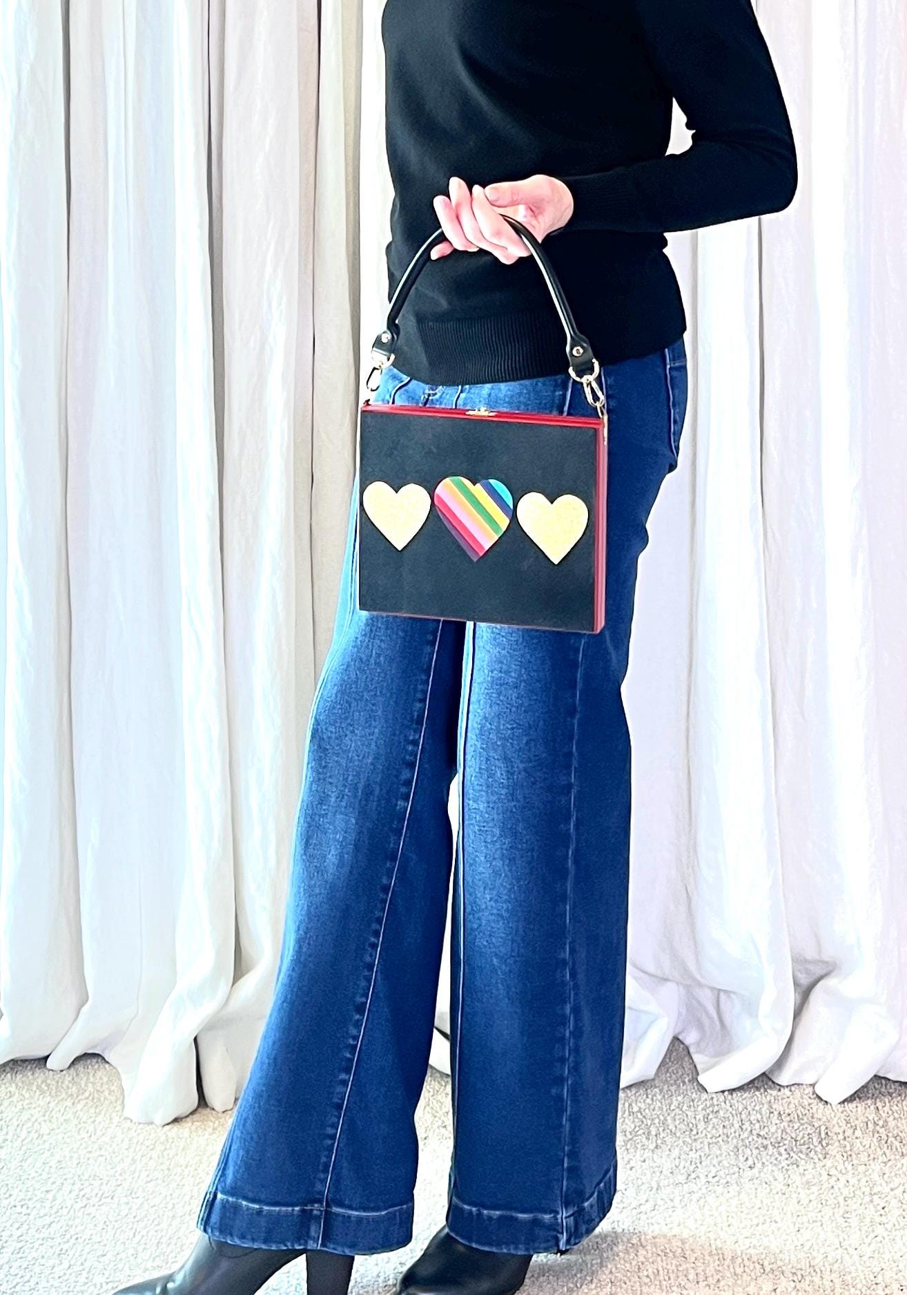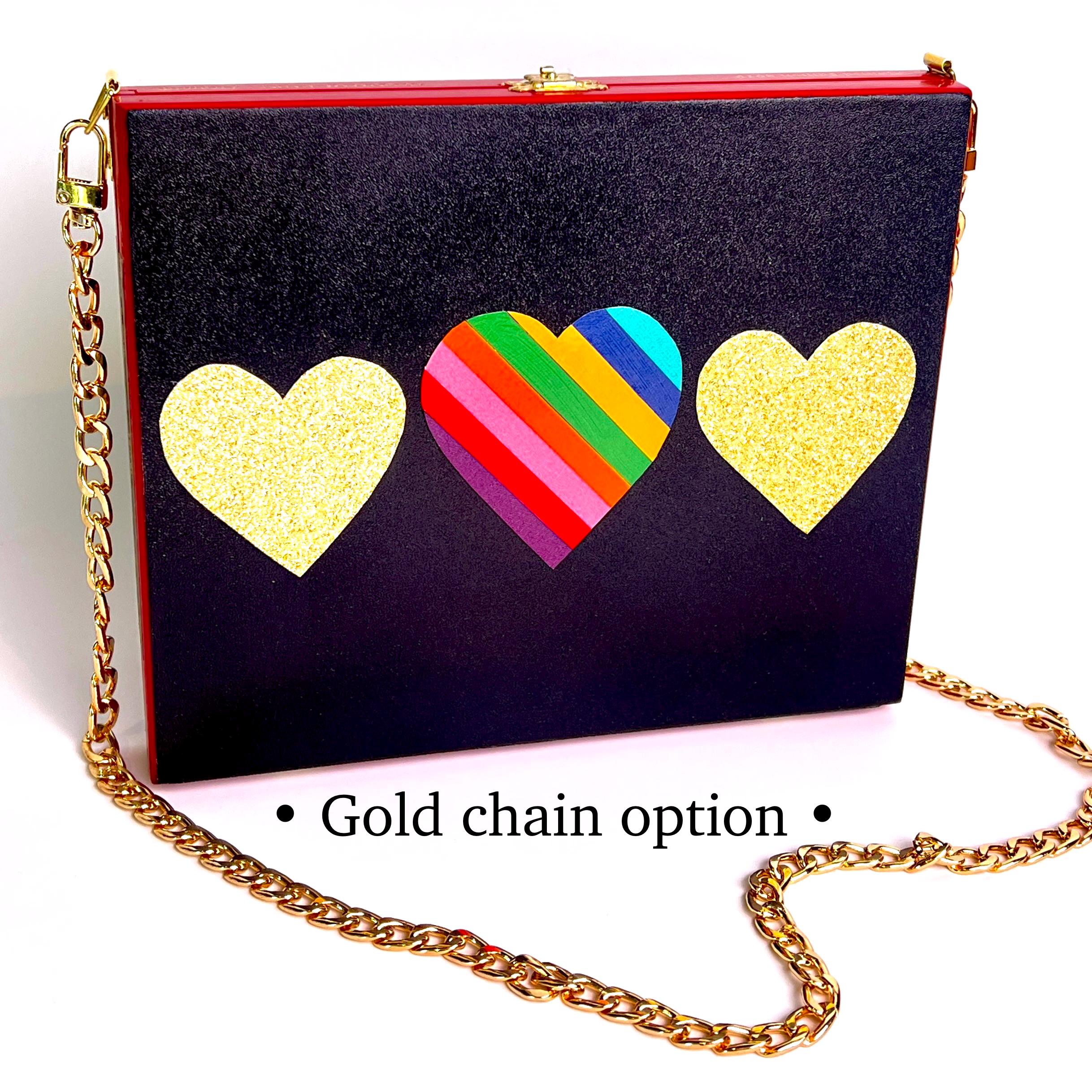 Pride Rainbow Hearts Purse, Black Glitter Handbag, LGBTQ Fashion, Red Cigar Box Evening Bag with Chain, Gold Hearts