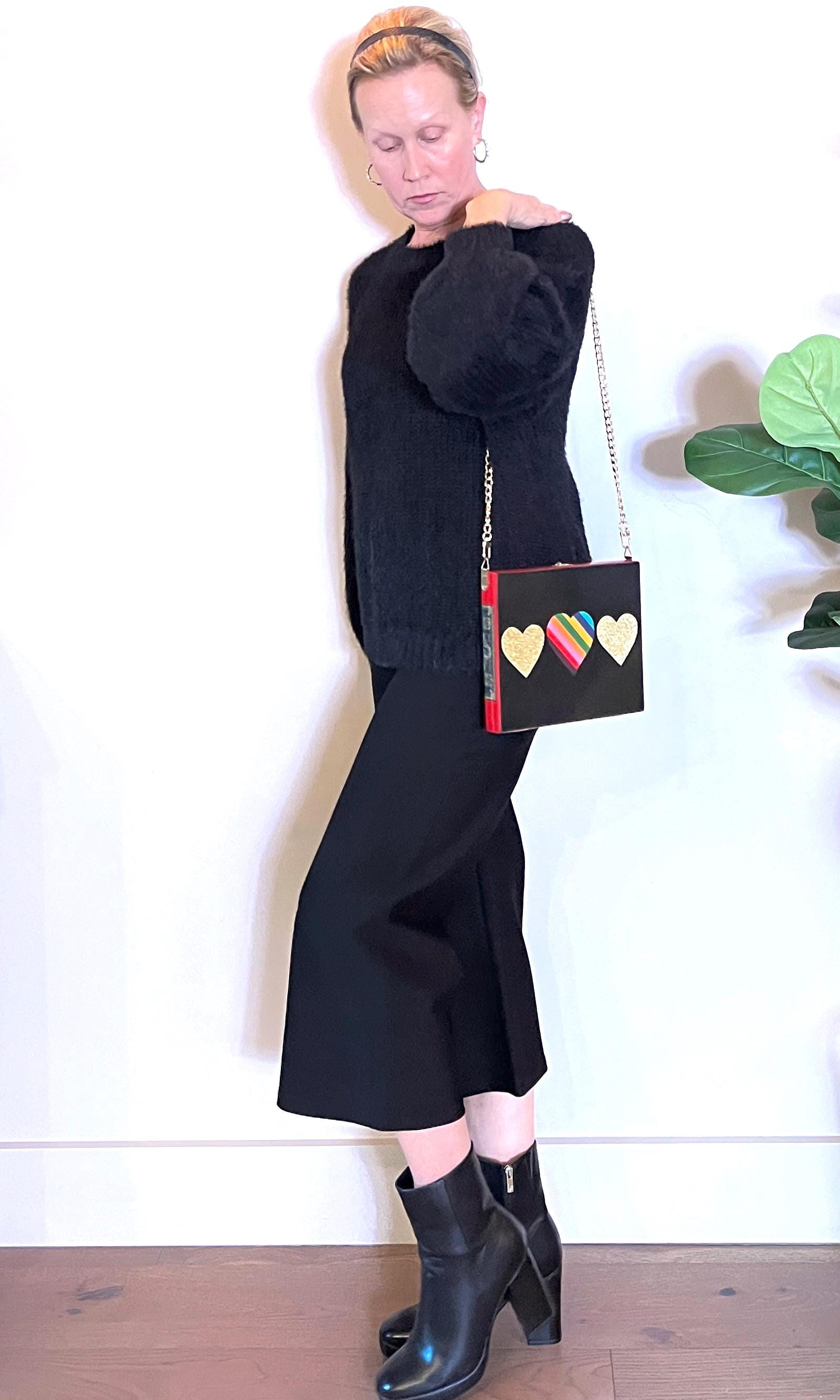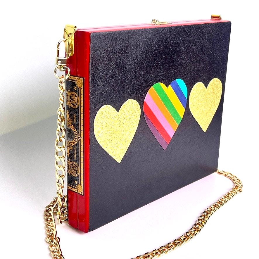 This glittery purse packs a lot into a small package! A rainbow heart is featured with gold hearts on either side, with a background of shimmering black on this bold cigar box purse. The glossy red original God of Fire cigar company box features the label inside the lid and on the top edge.