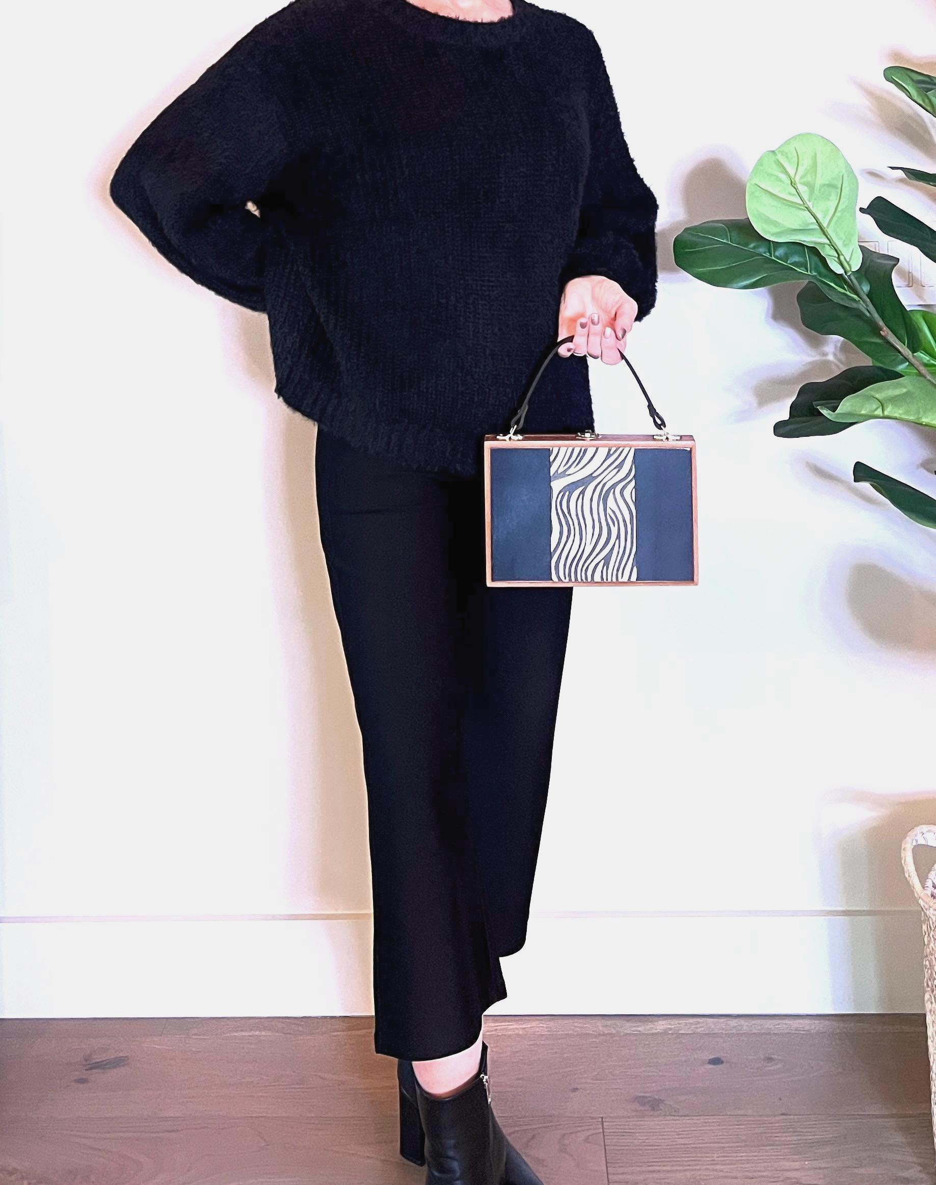 Turn some heads with this hip cigar box purse with an animal print! Upcycled from a beautiful warm tone wood cigar box, this handbag is decoupaged with black and zebra print papers. The finishing touches are the handmade leather handle and gold hardware. Perfect to dress up a pair of jeans, or add an unexpected touch to a little black dress!