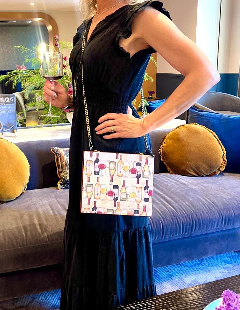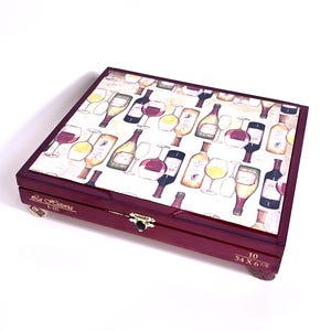 Perfect for a trip to wine country, this unique cigar box purse features a two-sided design. One side is covered in a vintage, distressed print of red and white wine glasses and bottles. The coordinating side is black and white polka dots. The decoupaged sides are finished with a matte sealer.