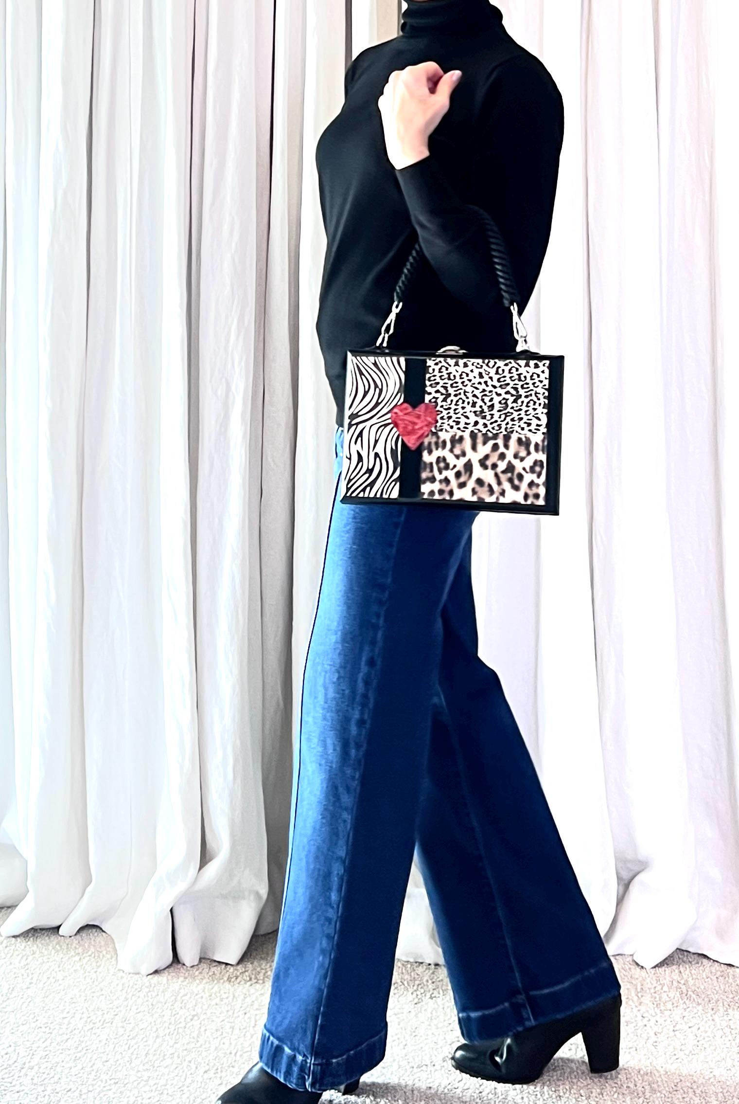 Bold & edgy, this handbag features a red heart embellishment as the focal point, layered on a collage of animal prints. The large black wood cigar box has been upcycled into a statement piece. One side is decoupaged with a mix of zebra, leopard and cheetah prints, while the other side is all zebra print. The glossy finish really makes this wild design shine!