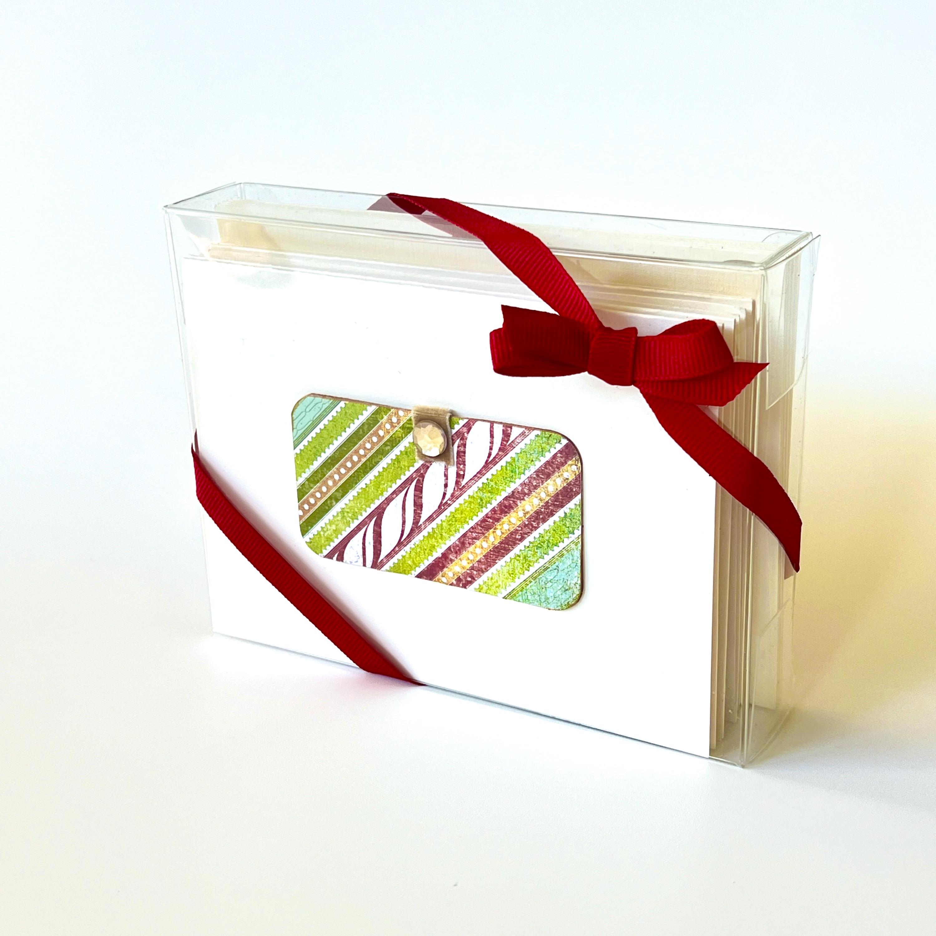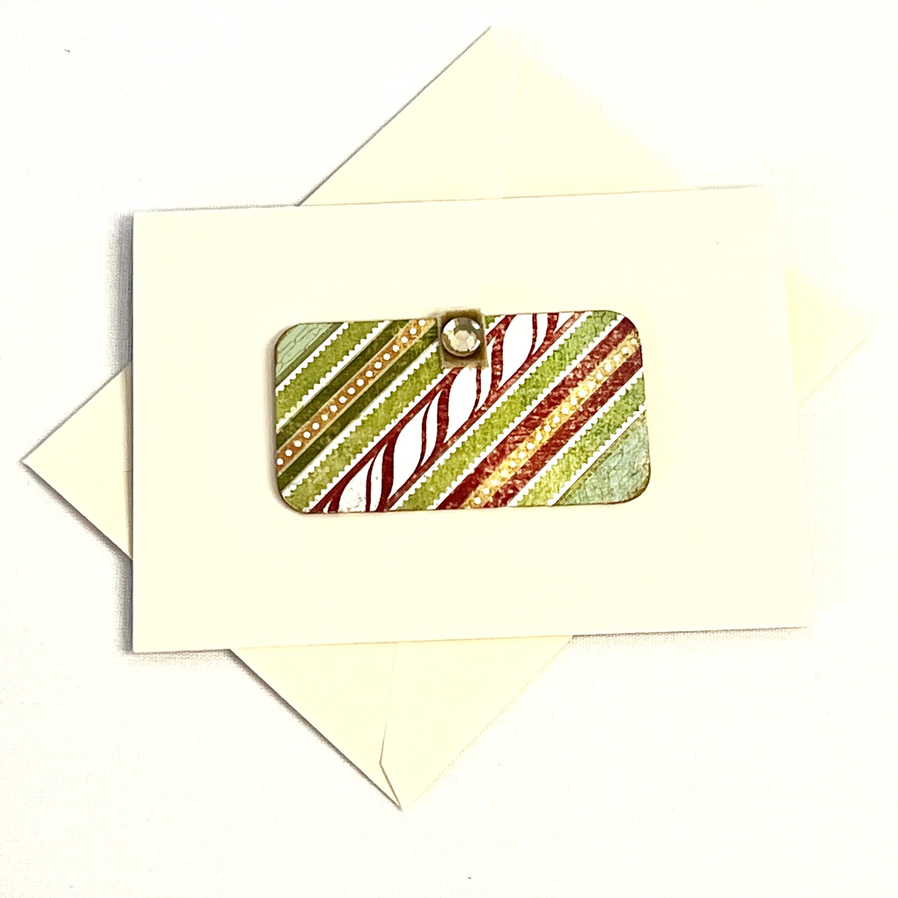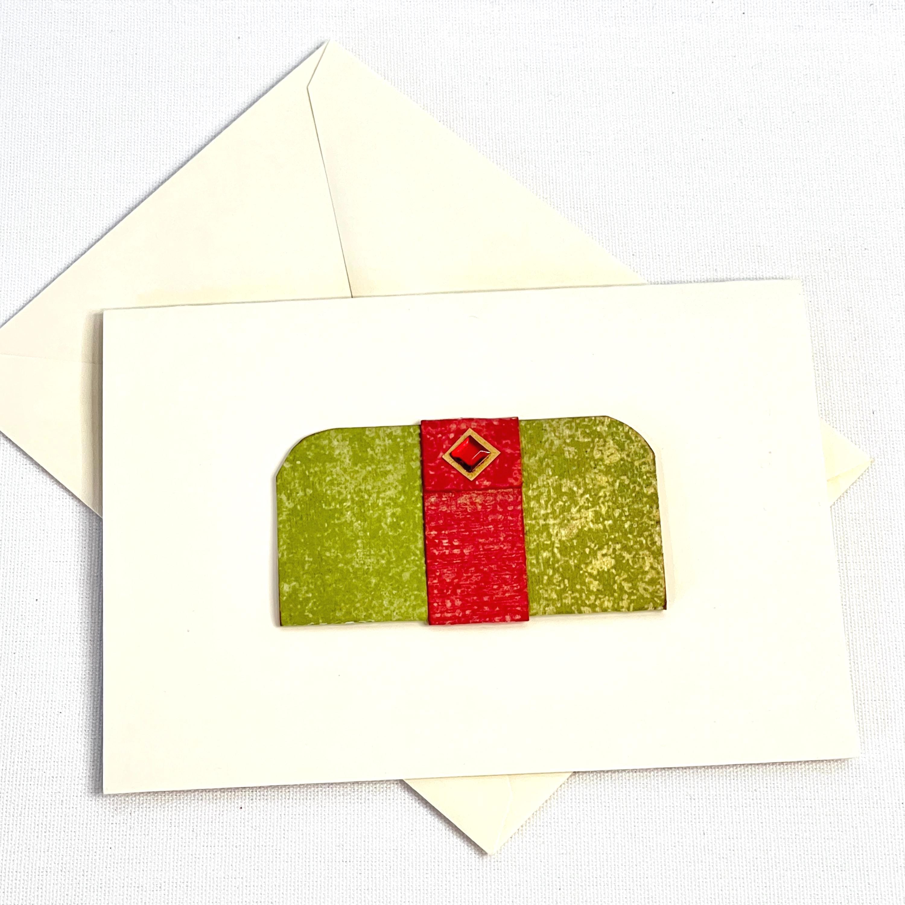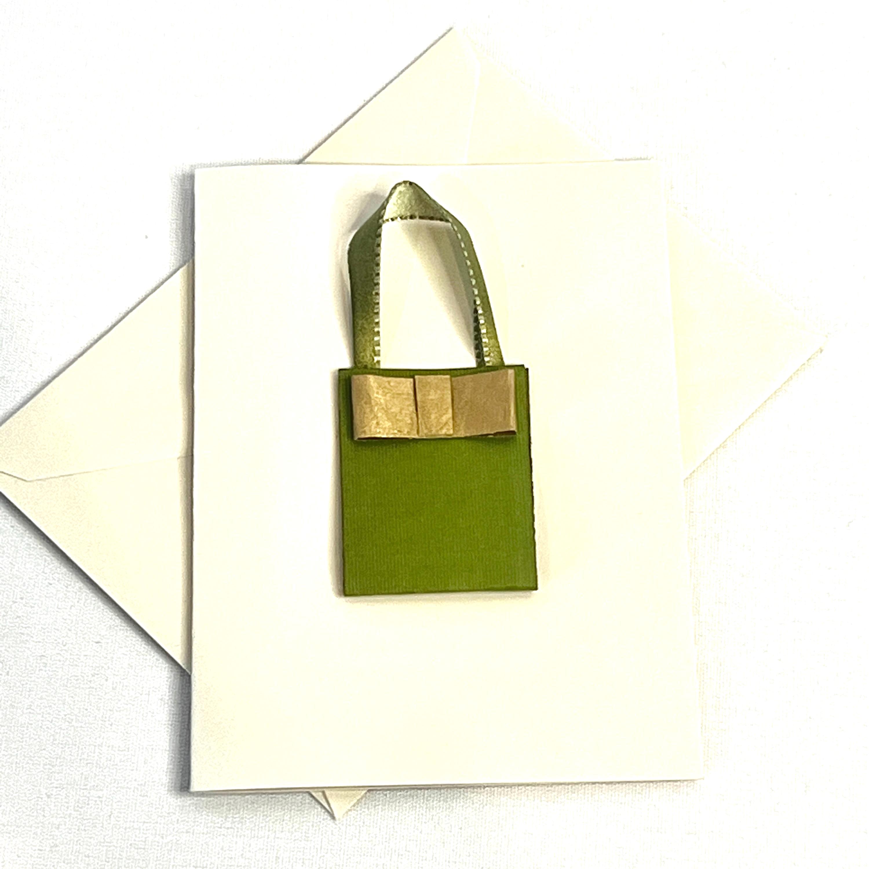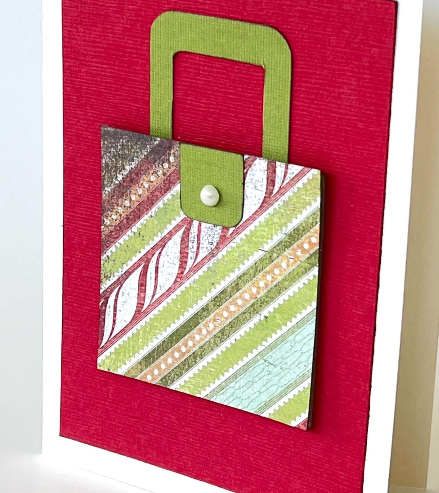 This set of 5 seasonal cards features mini handbags made from geometric printed and solid papers in a red and sage green color scheme. The three dimensional purses are detailed with different textures and distressing, rhinestones and ribbon.