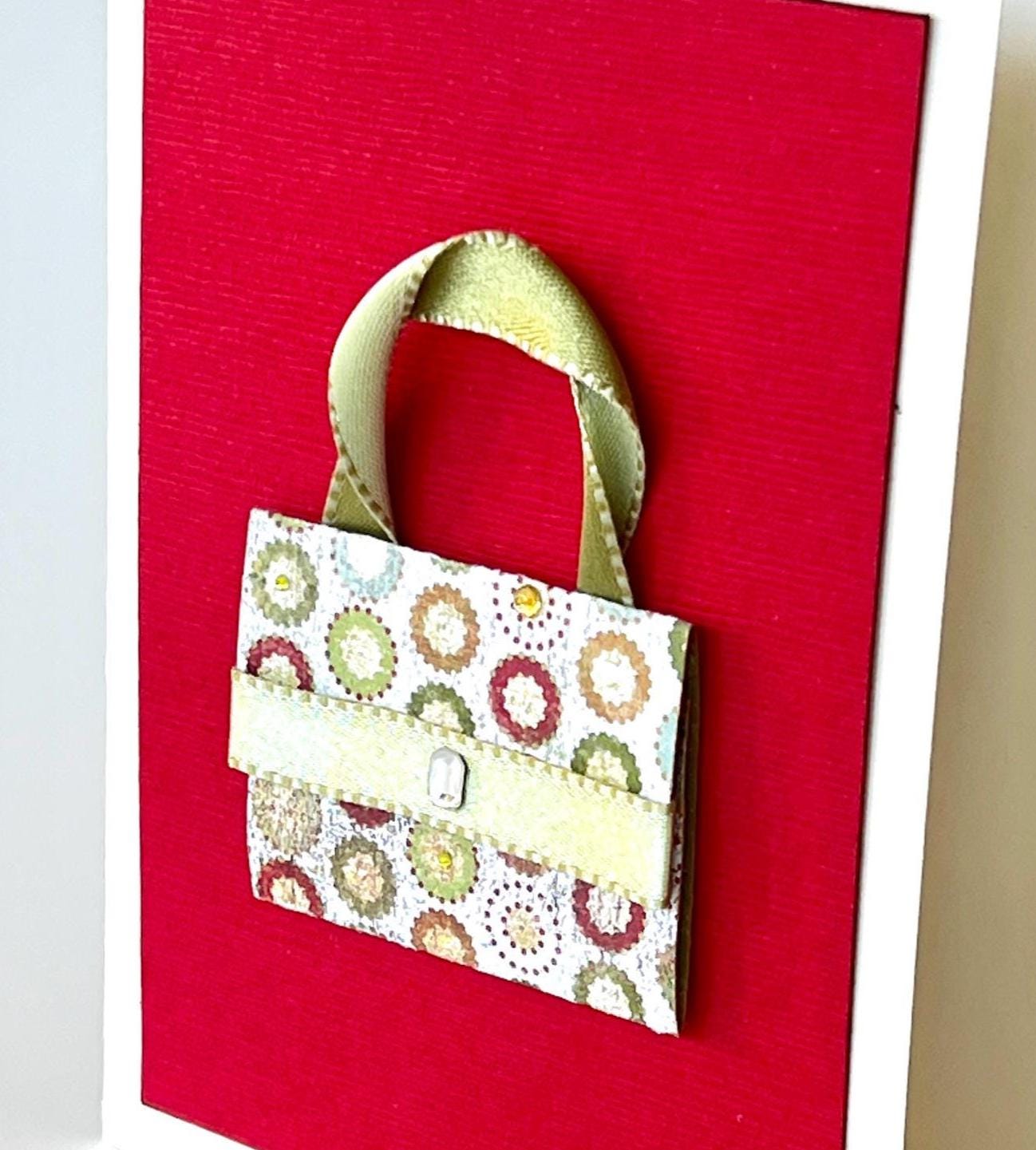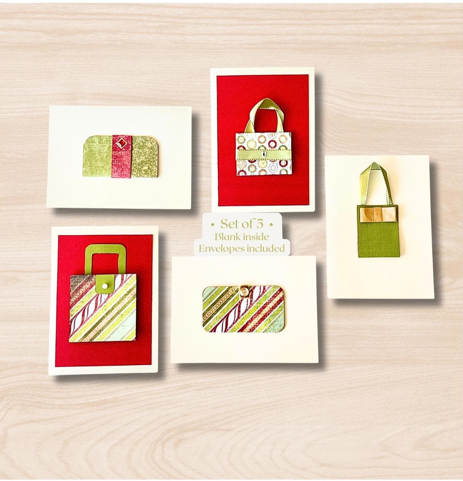 Holiday Christmas Embellished Cards: Red & Green Purse Themed, Set of 5, Three Dimensional Mini Handbags, Ribbon, Rhinestones