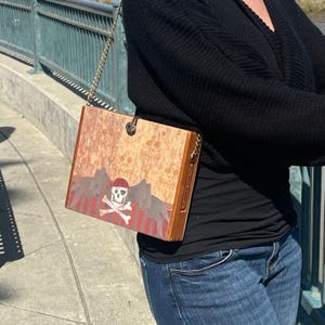 This fun and flirty holiday purse, with it's "Naughty or Nice" theme will really get you in the Christmas spirit! The wood cigar box has been transformed with candy cane stripes on the "NAUGHTY" side, and a red polka dot pattern on the "NICE" side! The bold magazine cut-out letters are layered on a bright green background. Choose how to carry the handbag depending on your mood! The finishing touch is a cute grosgrain ribbon bow and bell embellishment.