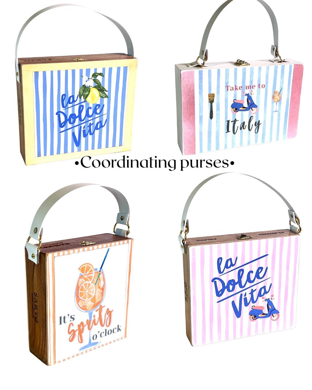 This cute Italy themed purse is made from a recycled wood cigar box. The phrase "la dolce vita" in bright blue is layered on a pink & white striped background and an image of a Vespa in coordinating colors completes the vintage beach club vibe.