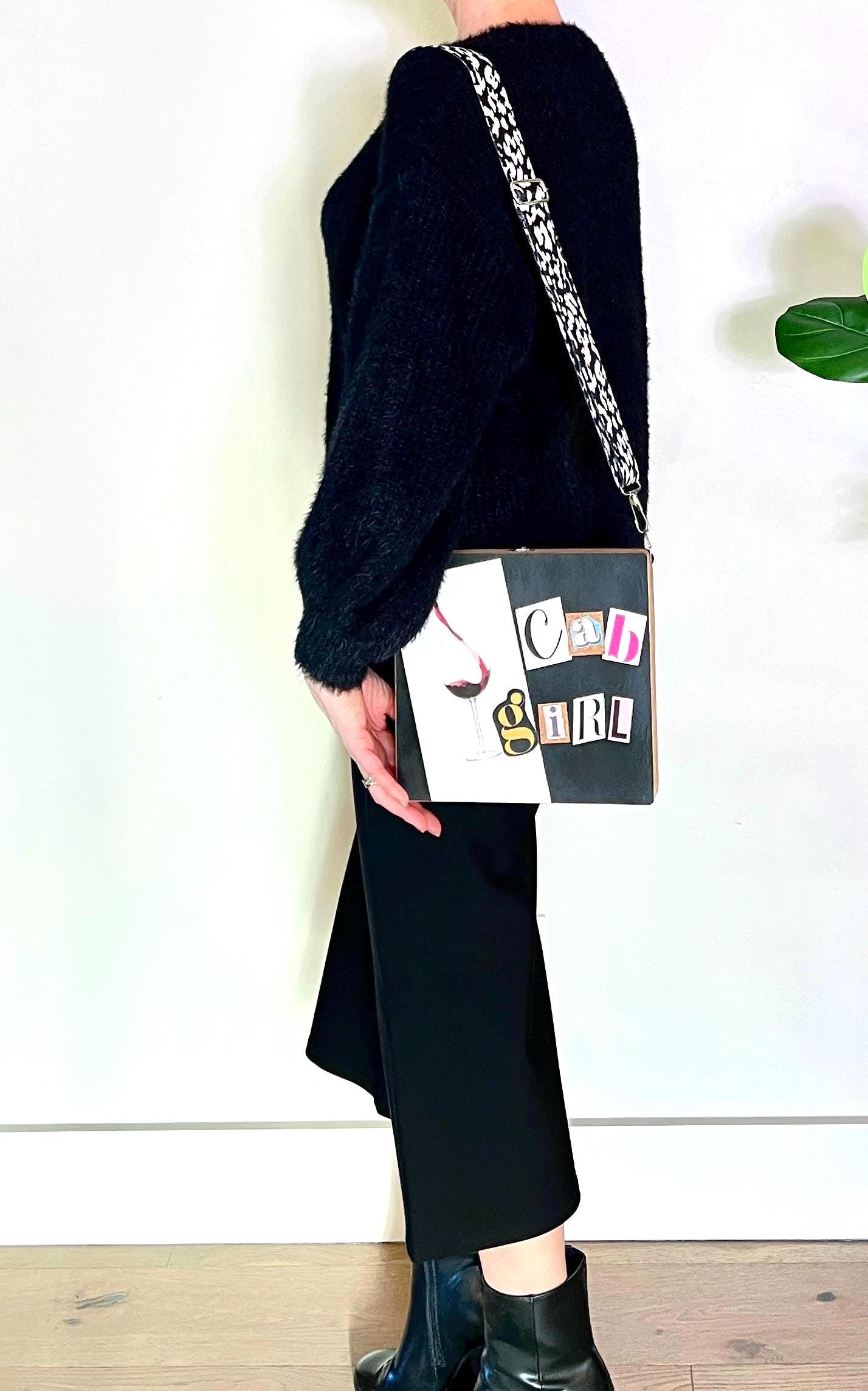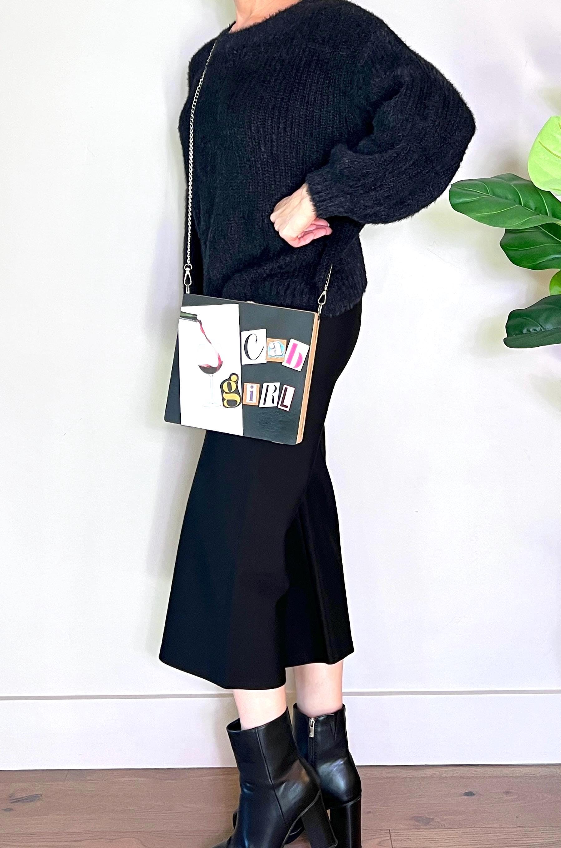 This one is for the "Cab Girl" who always orders a big glass of Cabernet! Upcycled from an authentic Napa Cigar Society wood box, this purse features fun cut-out lettering and a splashy glass of red wine. The interior has a mirror and is lined in cork.