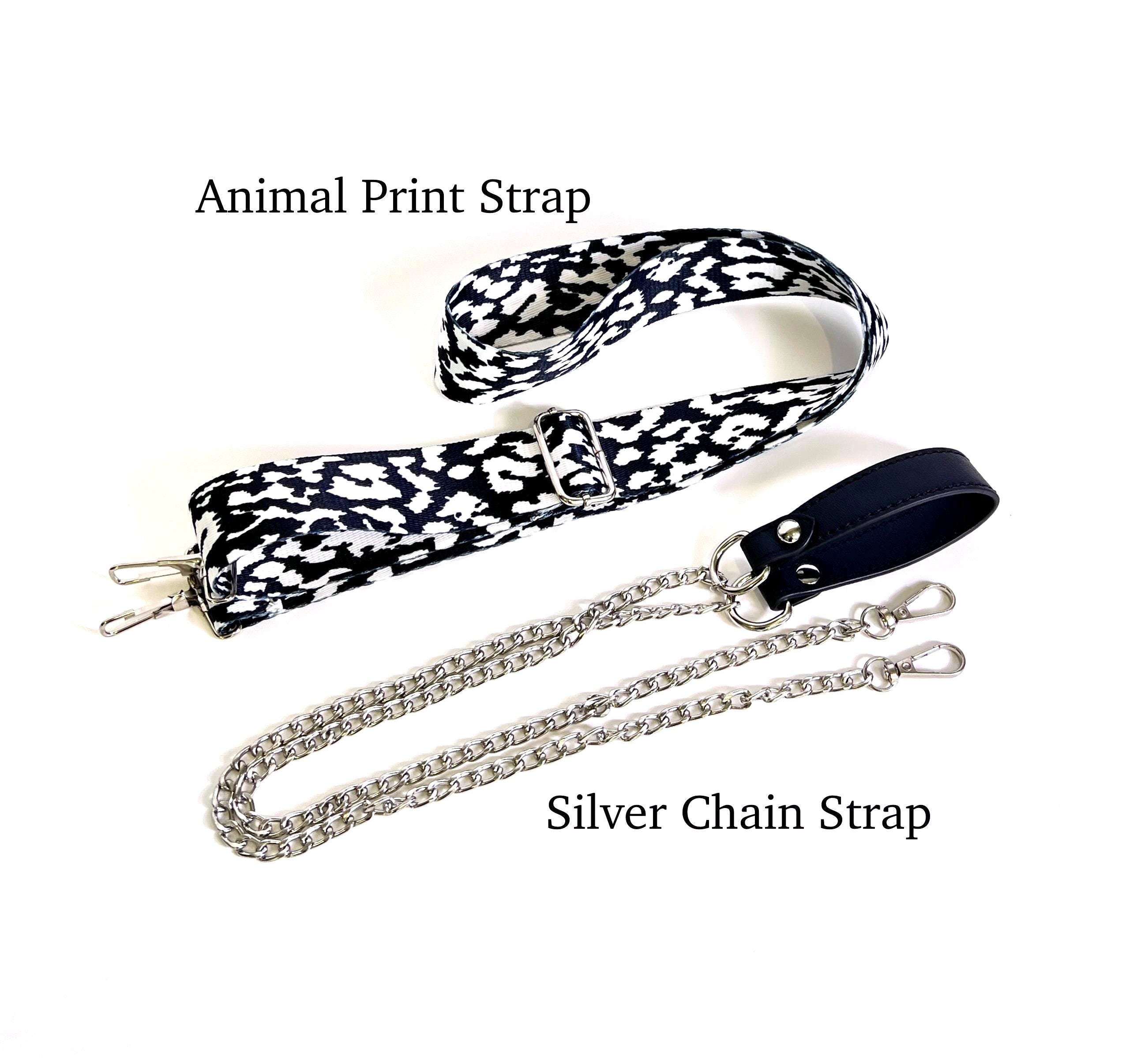 • Black & white animal print strap, 1.5 inches wide, adjustable for shoulder or crossbody wear