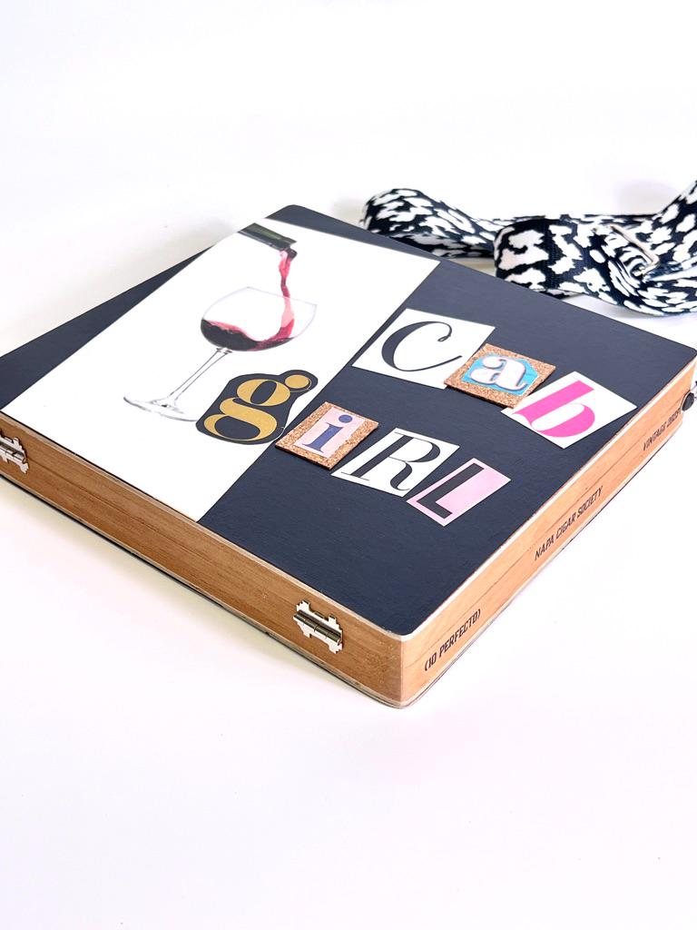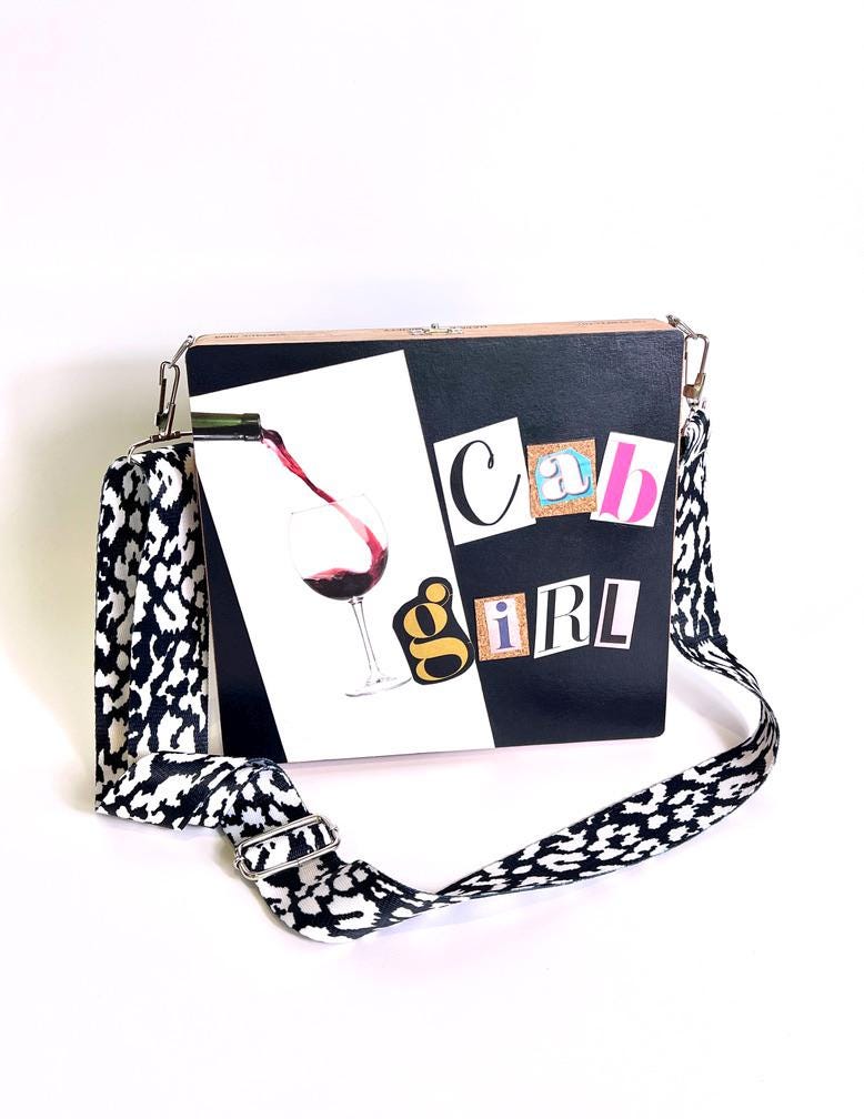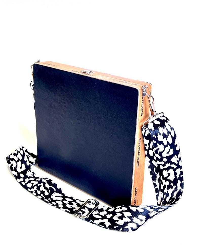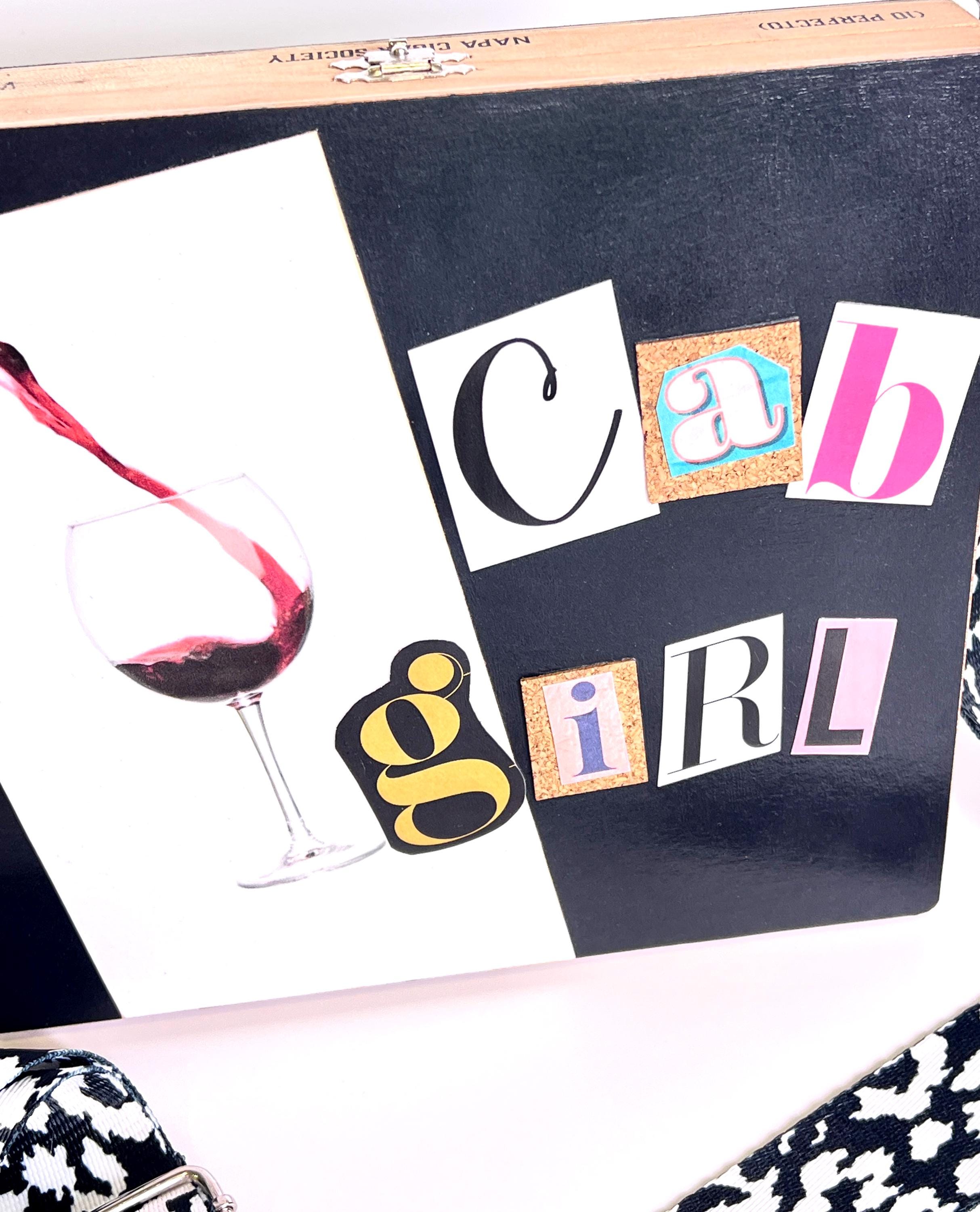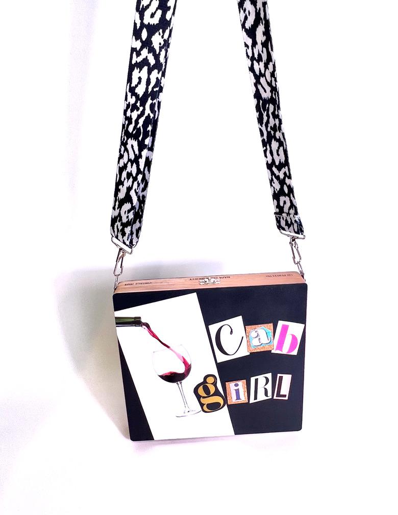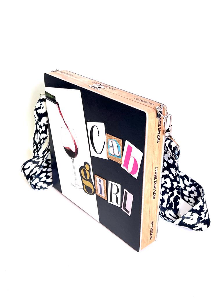 This one is for the "Cab Girl" who always orders a big glass of Cabernet! Upcycled from an authentic Napa Cigar Society wood box, this purse features fun cut-out lettering and a splashy glass of red wine. The black & white animal print adjustable shoulder strap adds a wild touch. The interior has a mirror and is lined in cork.