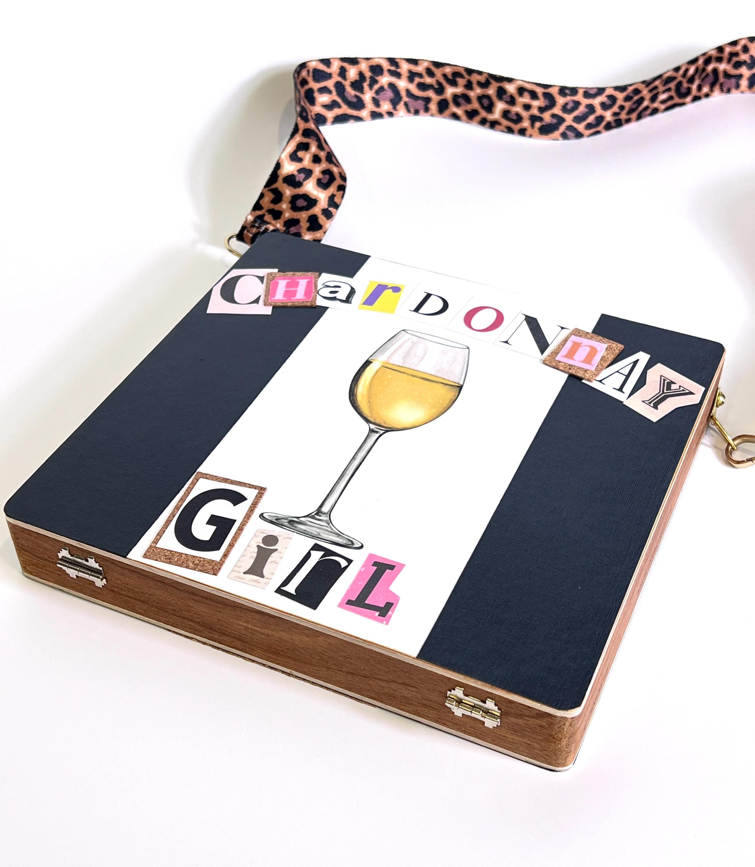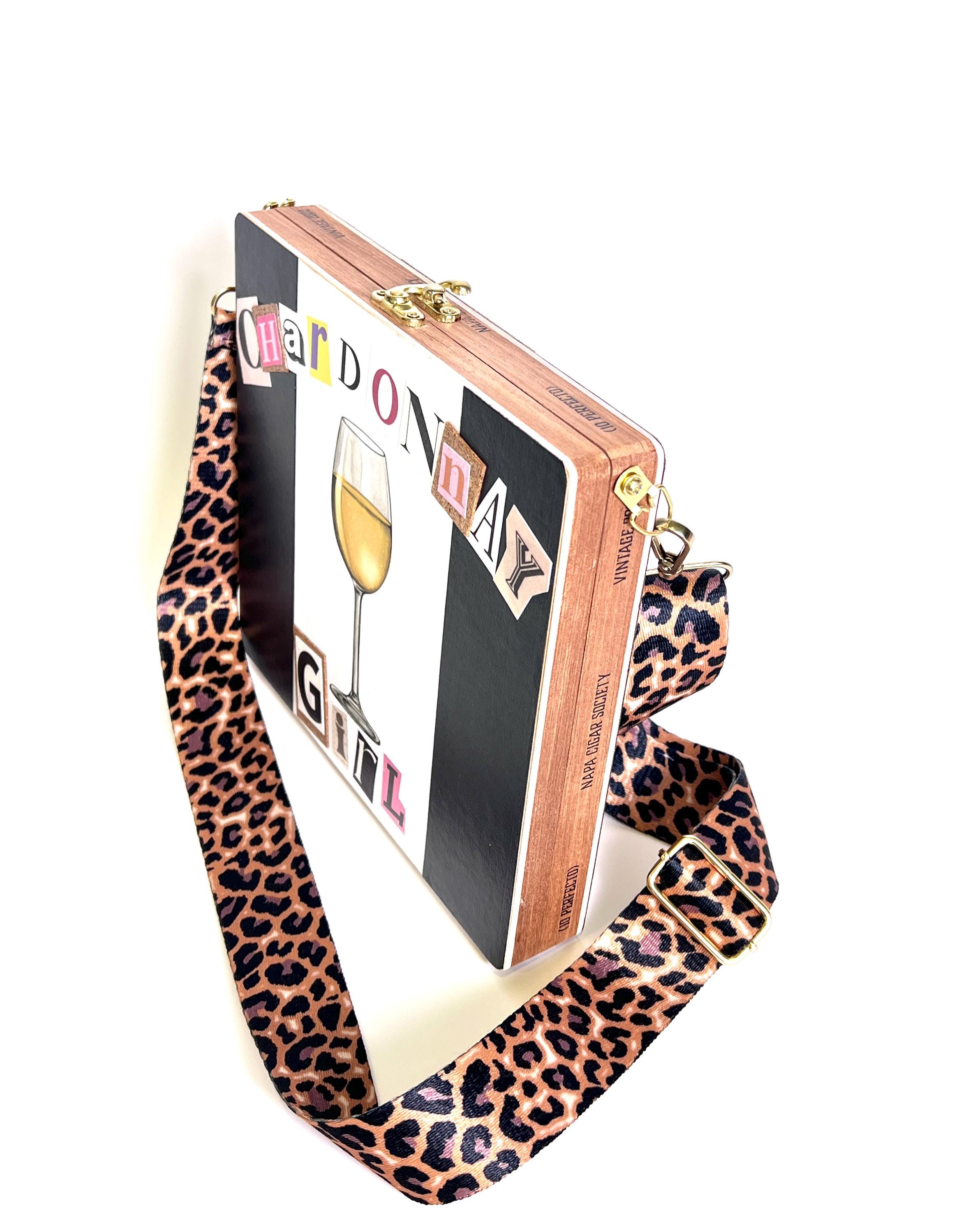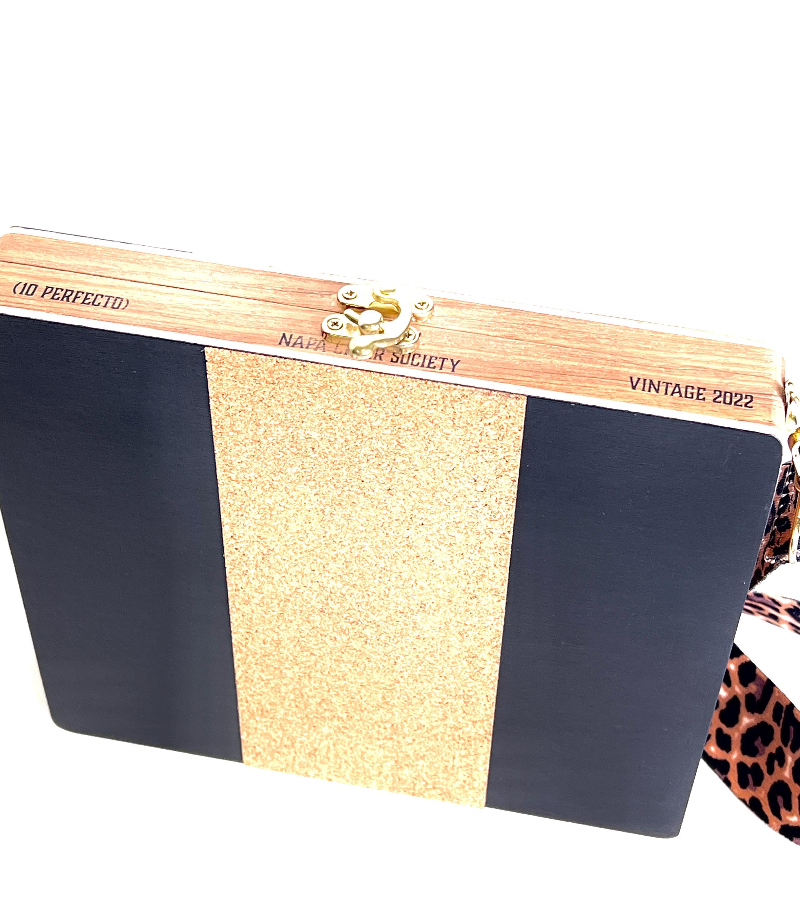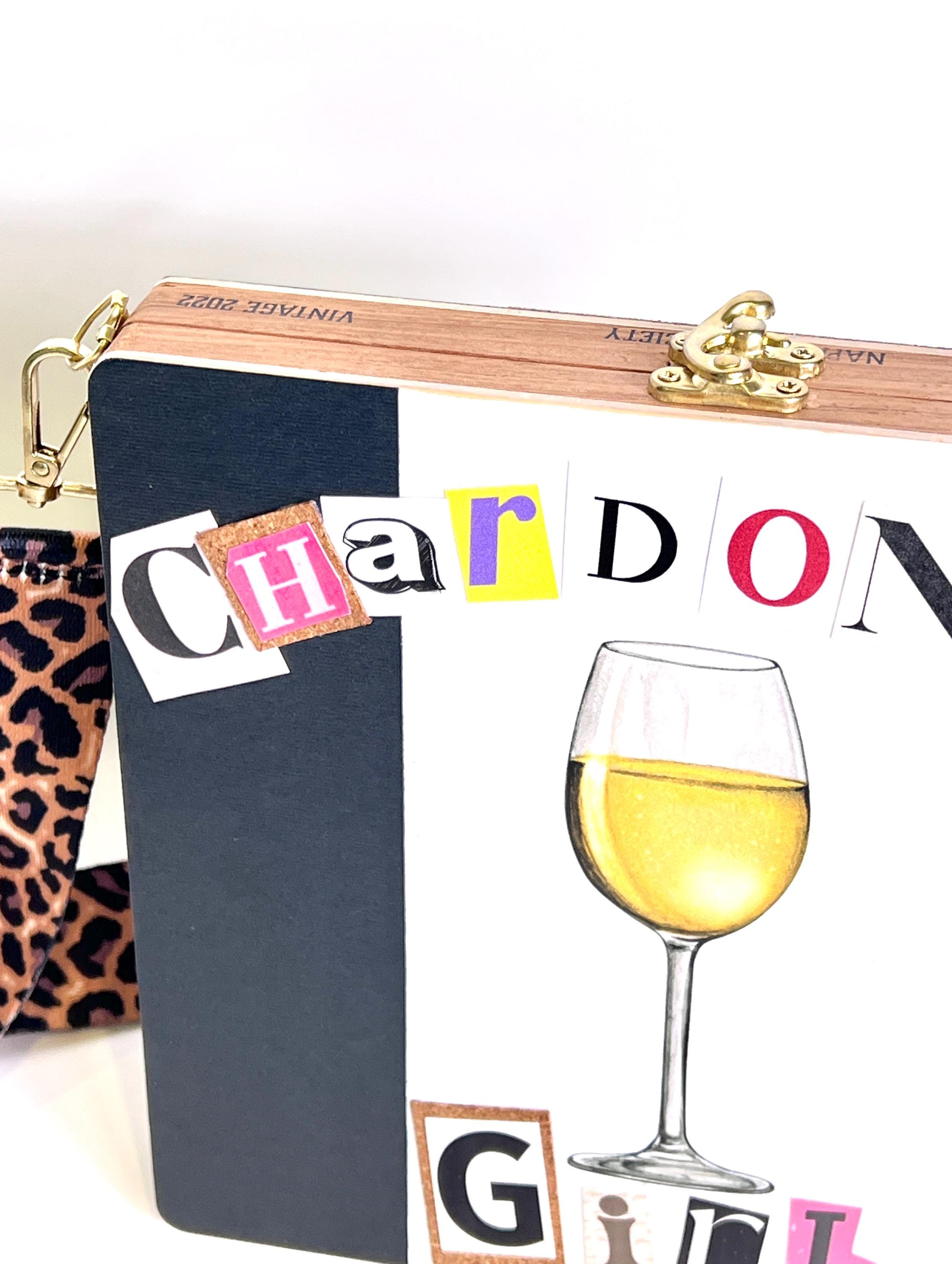 This one is for the "Chardonnay Girl"! Express your passion for wine with this bold statement purse. Upcycled from an authentic Napa Cigar Society wood box, this purse features fun cut-out lettering and a glass of white wine. The coordinating side is black with a band of cork.