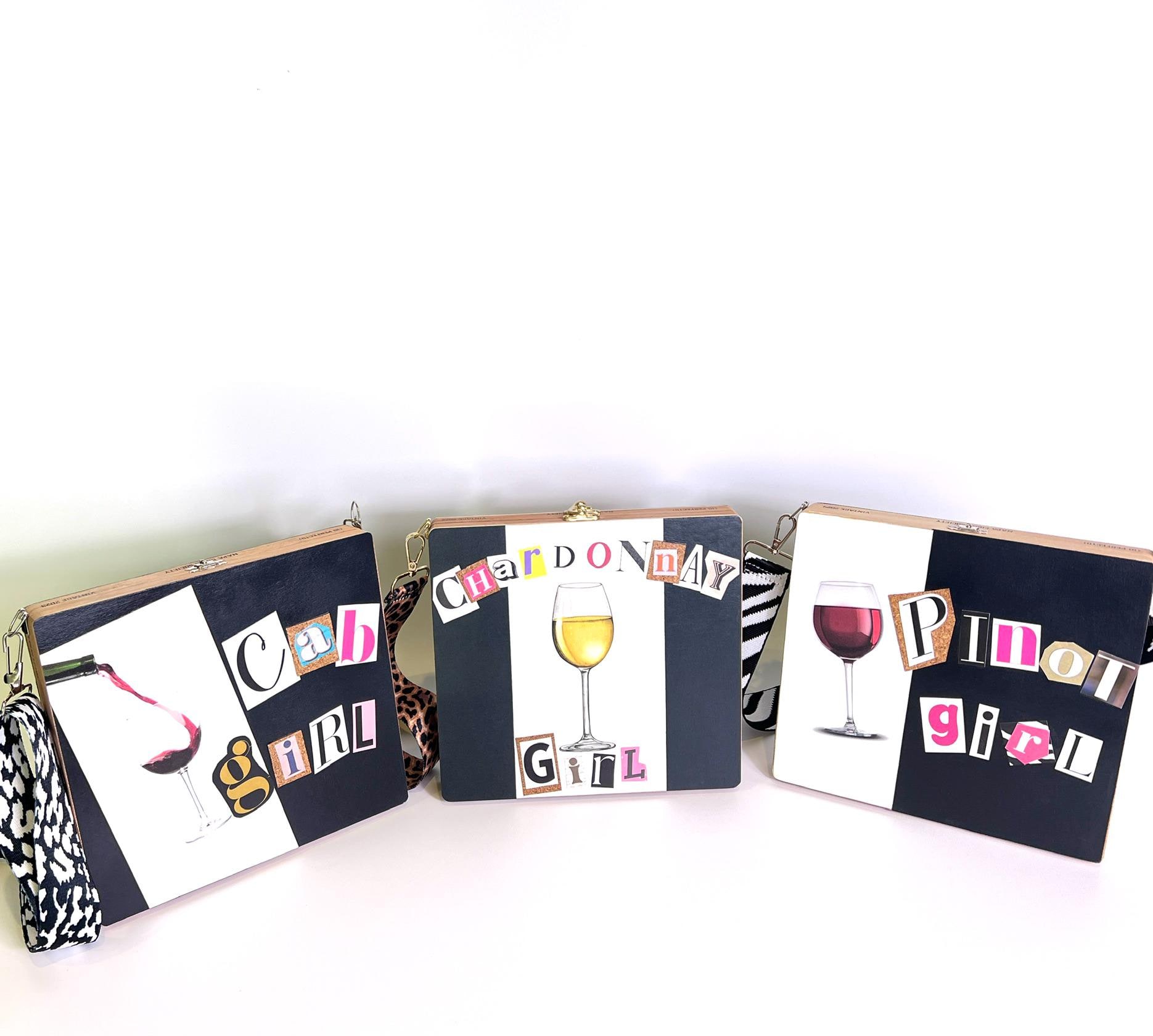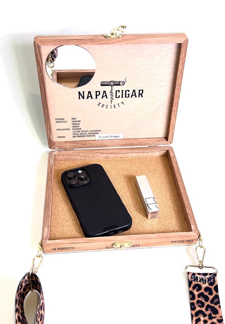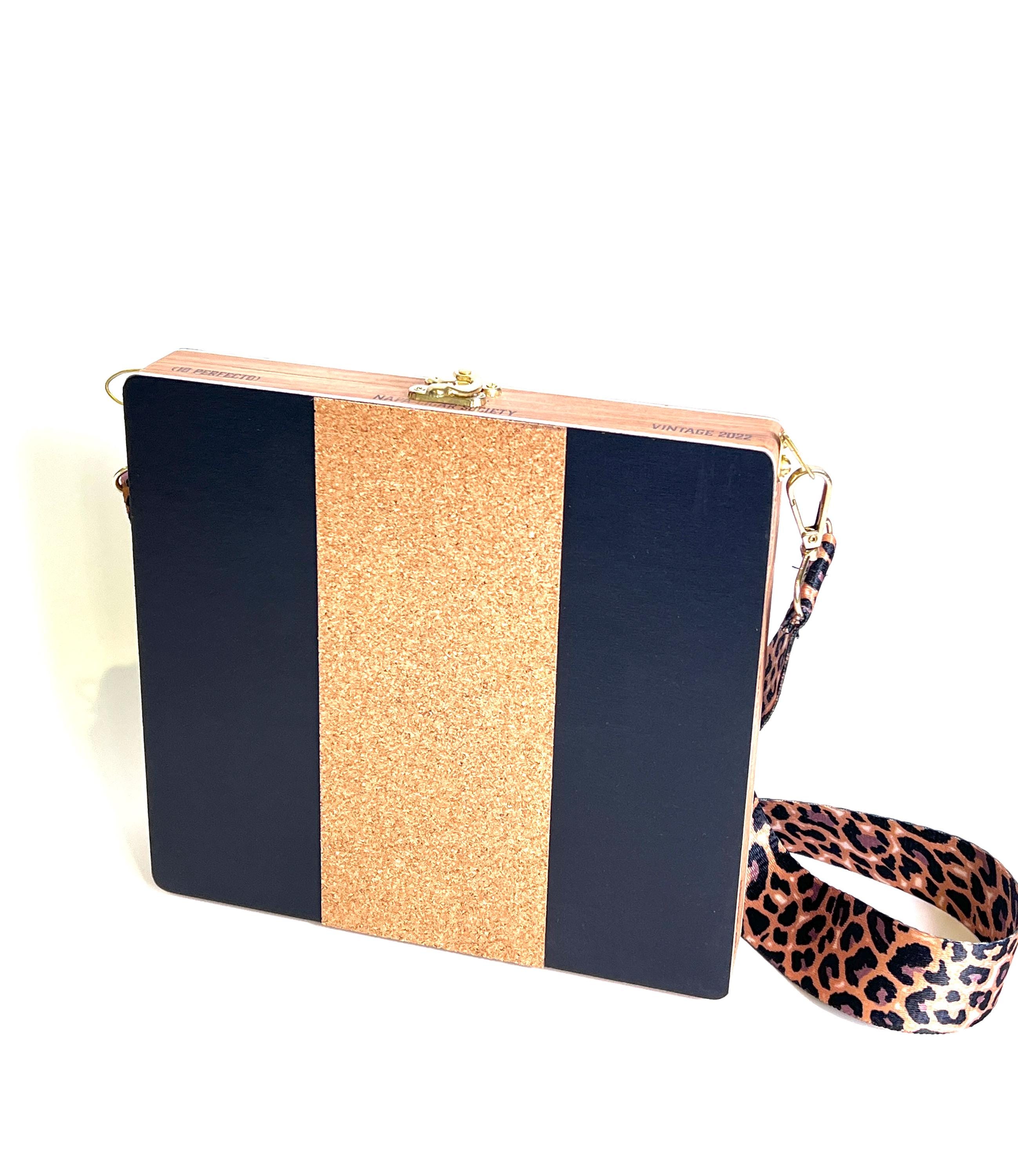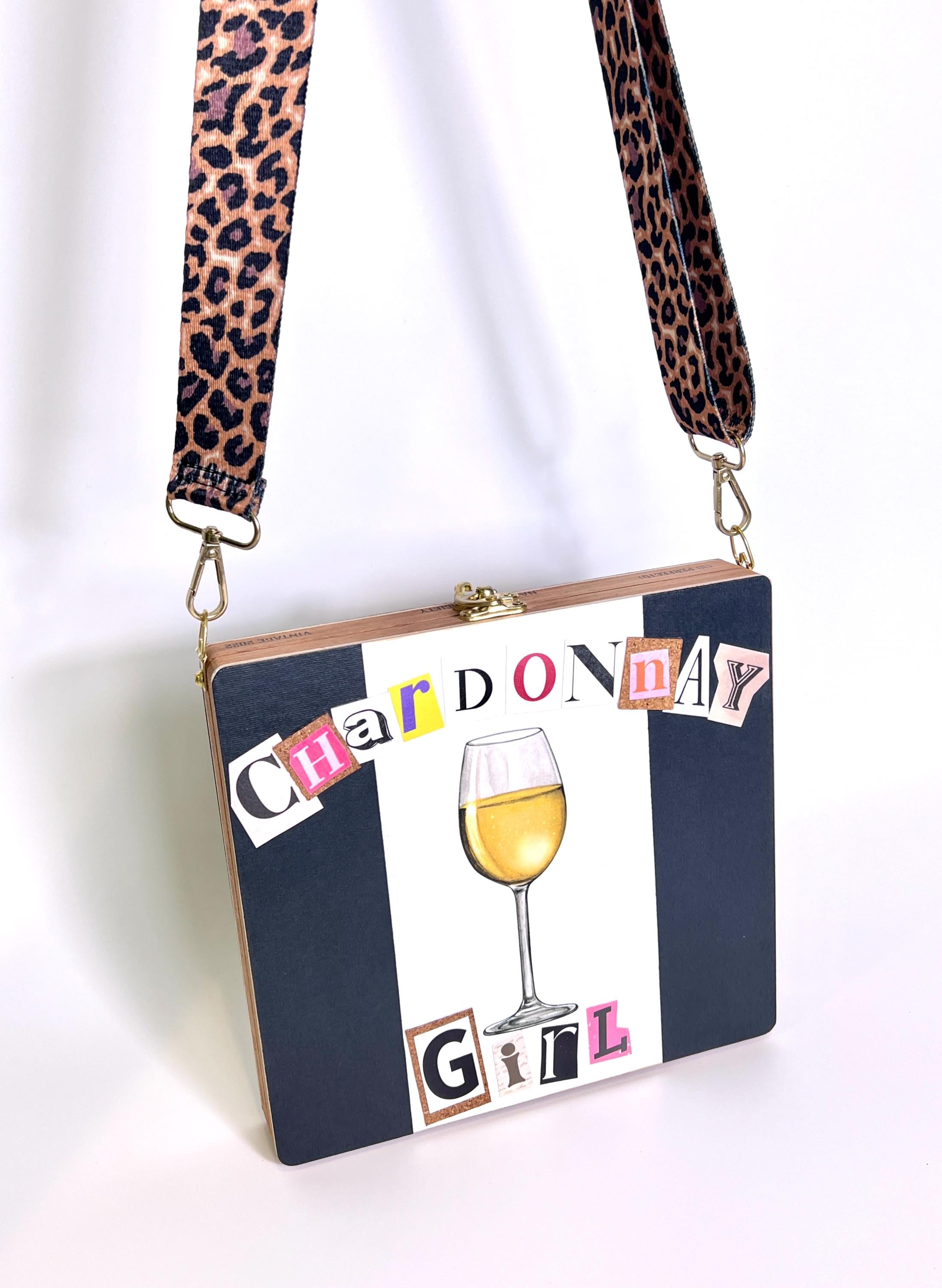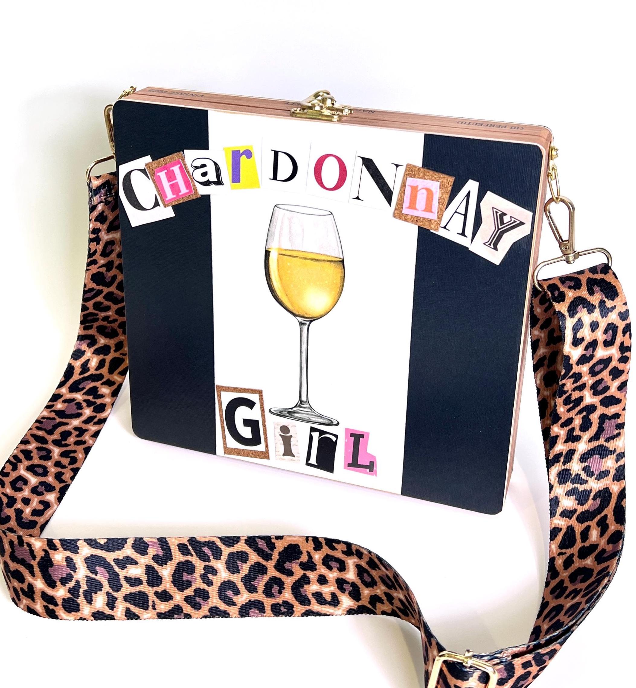 This one is for the "Chardonnay Girl"! Express your passion for wine with this bold statement purse. Upcycled from an authentic Napa Cigar Society wood box, this purse features fun cut-out lettering and a glass of white wine. The coordinating side is black with a band of cork.