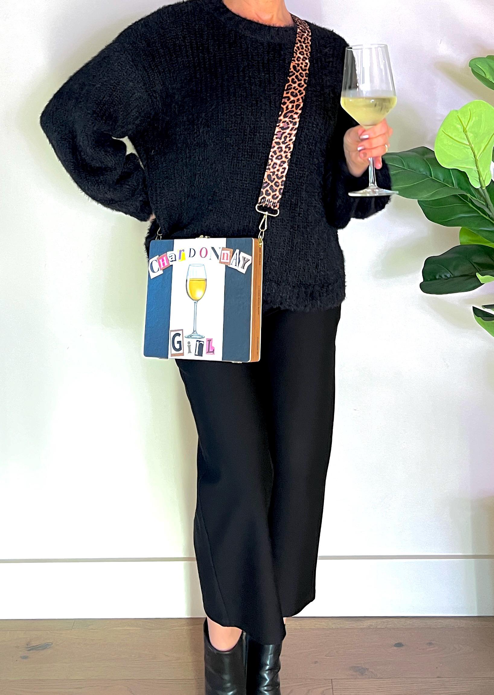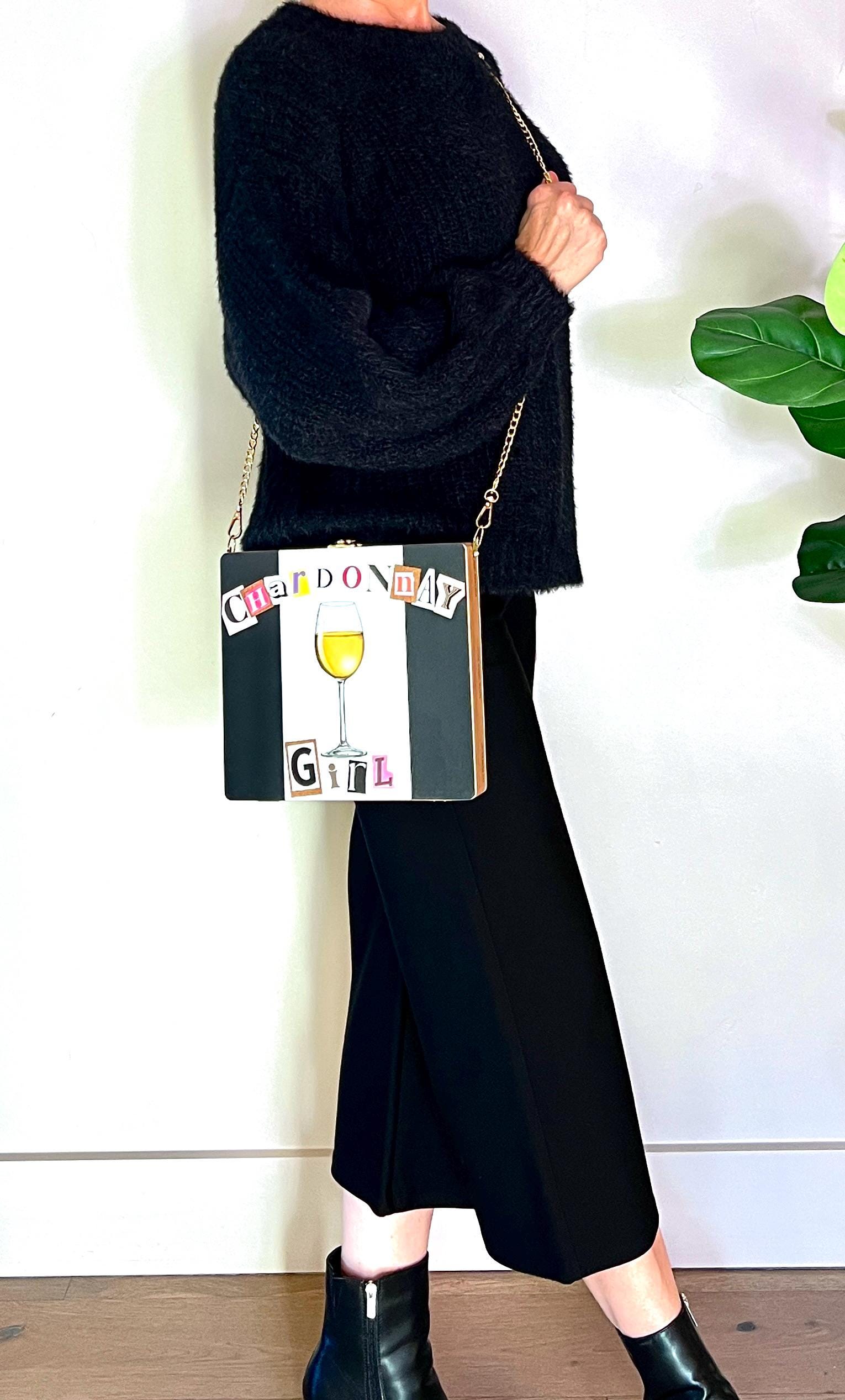 This one is for the "Chardonnay Girl"! Express your passion for wine with this bold statement purse. Upcycled from an authentic Napa Cigar Society wood box, this purse features fun cut-out lettering and a glass of white wine. The coordinating side has a band of cork over solid black. The interior includes a mirror and is lined in cork.