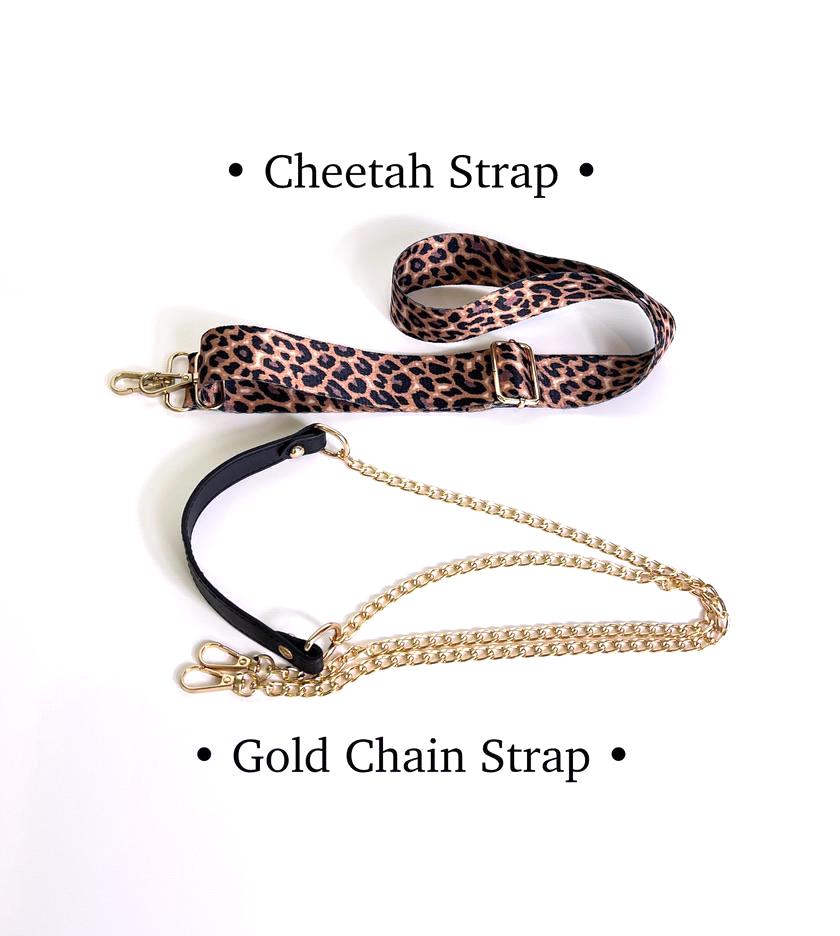 • Cheetah print strap, 1.5 inches wide, adjustable for shoulder or crossbody wear