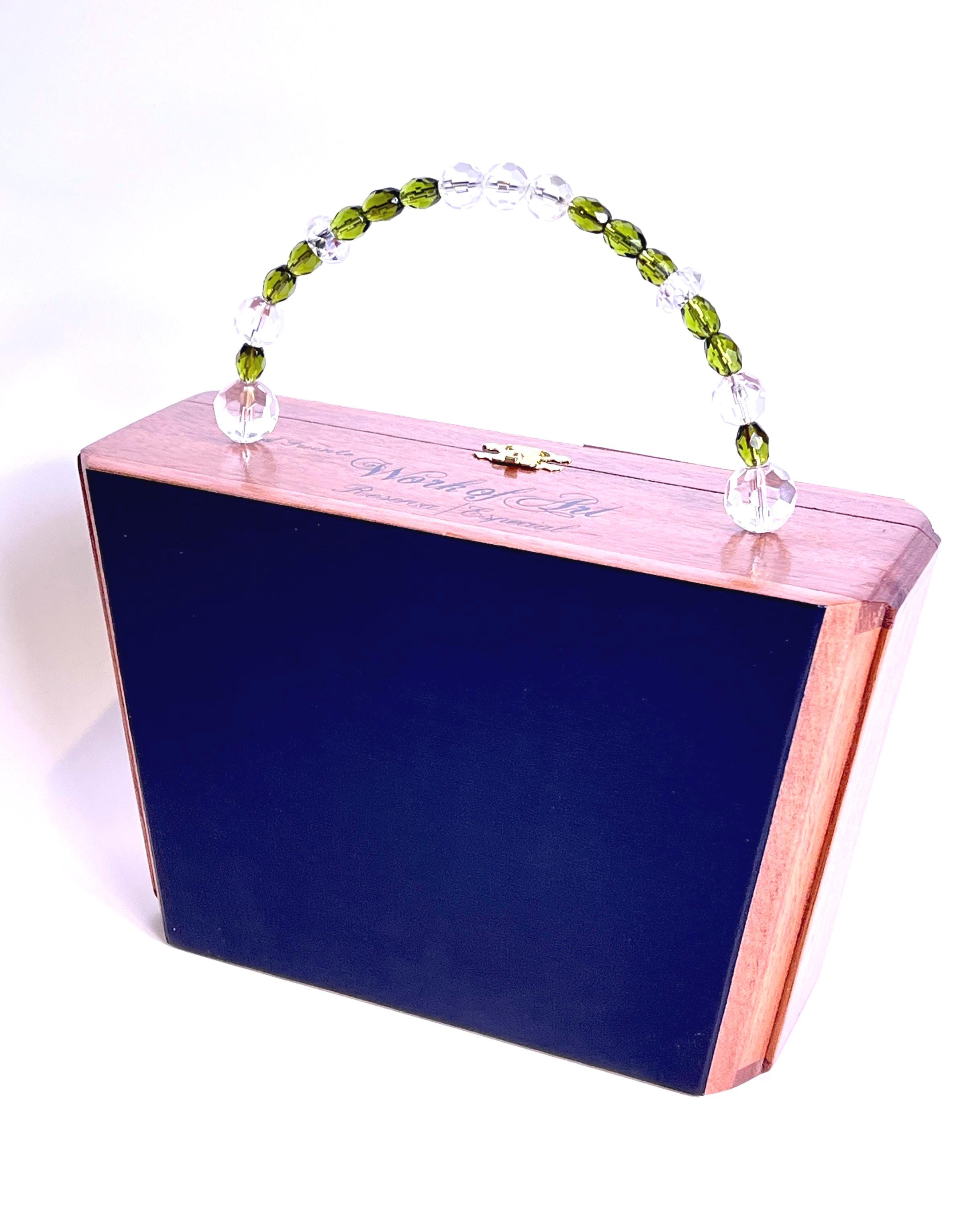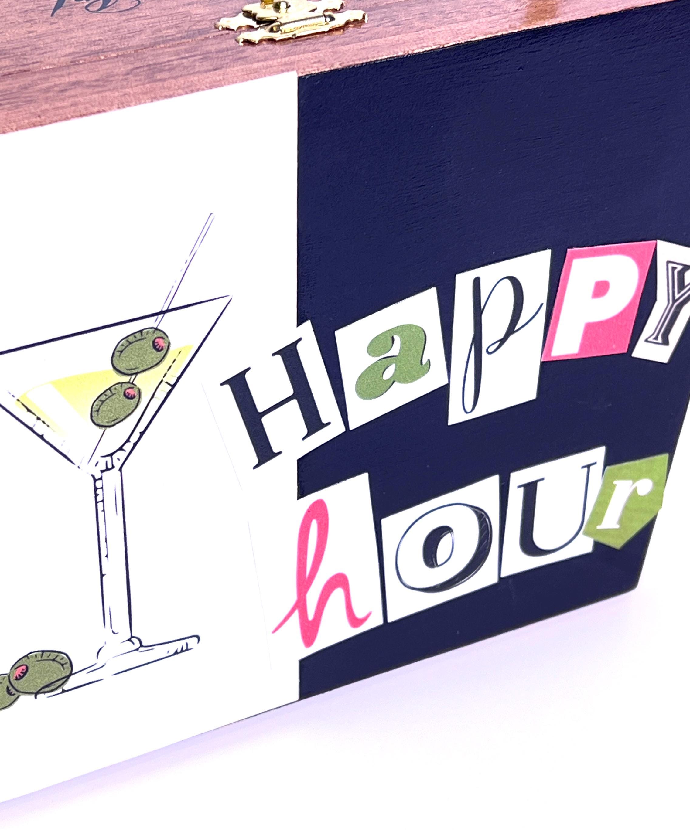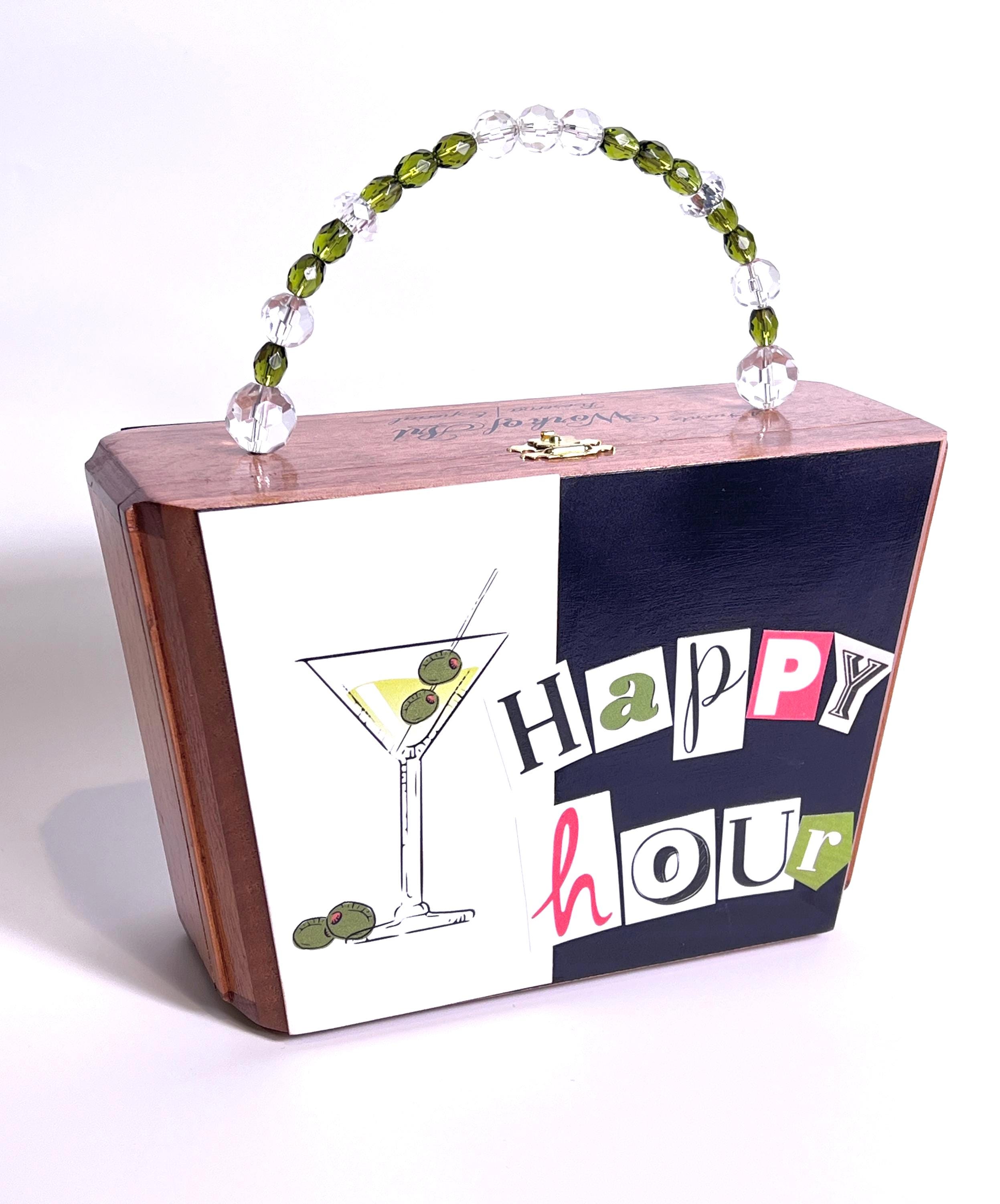 This fun & flirty purse features an image of a martini with olives & bold cut-out letters spelling "Happy Hour". Made from a beautiful and uniquely shaped recycled cigar box, this handbag is one of a kind! The black & white color scheme is accented with pops of red and olive green. The finishing touches are a crystal beaded handle and cork lining.