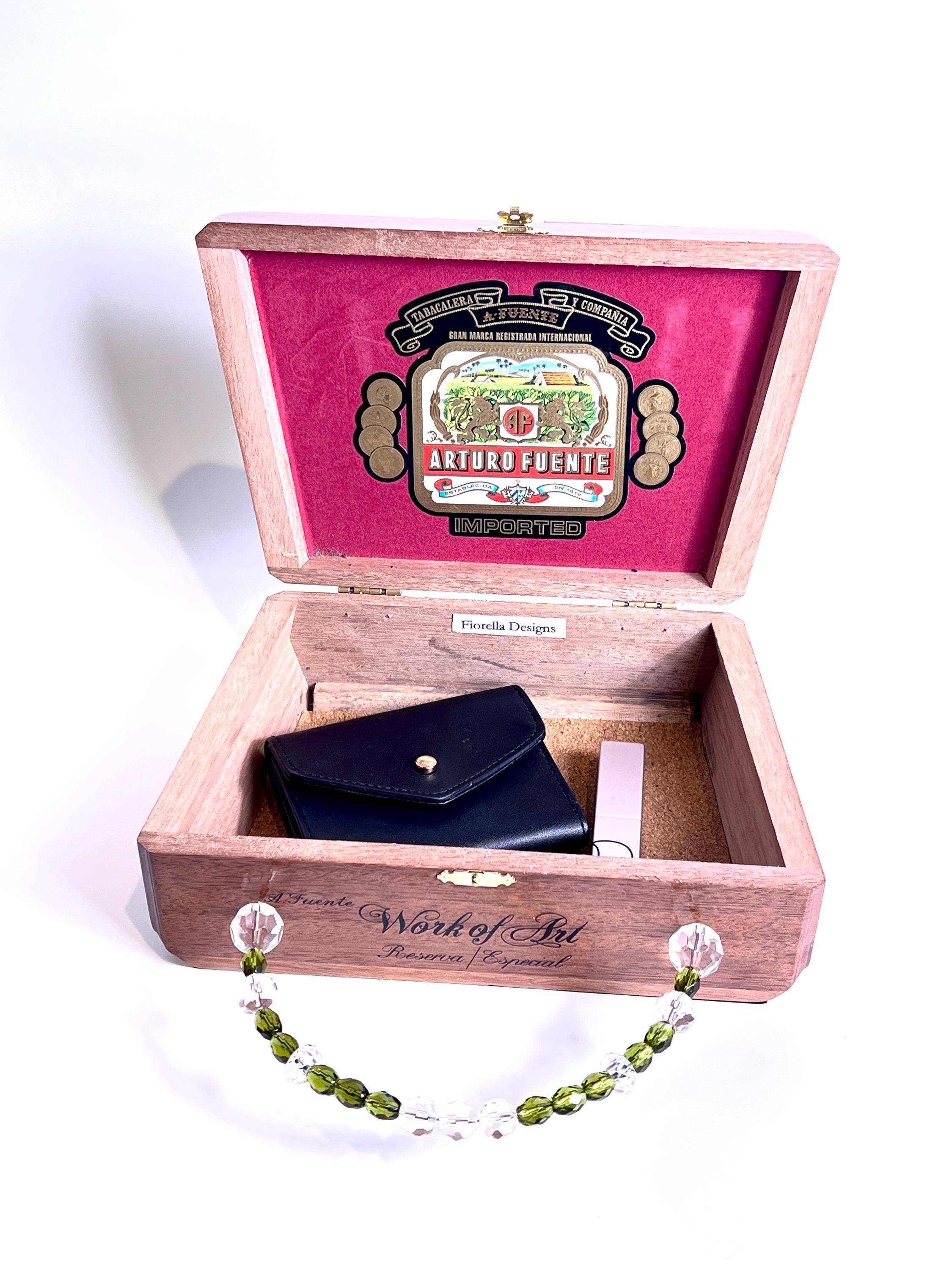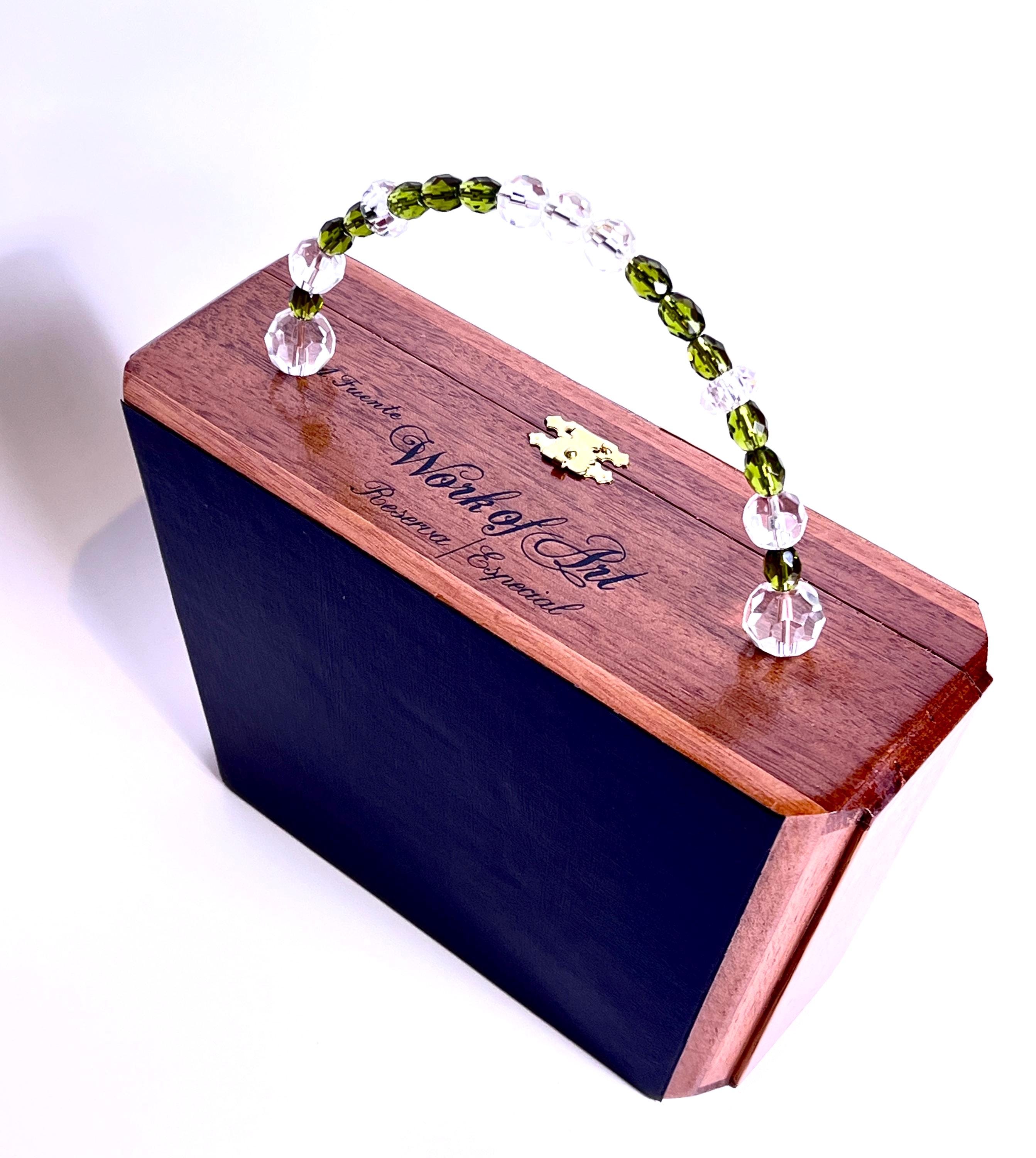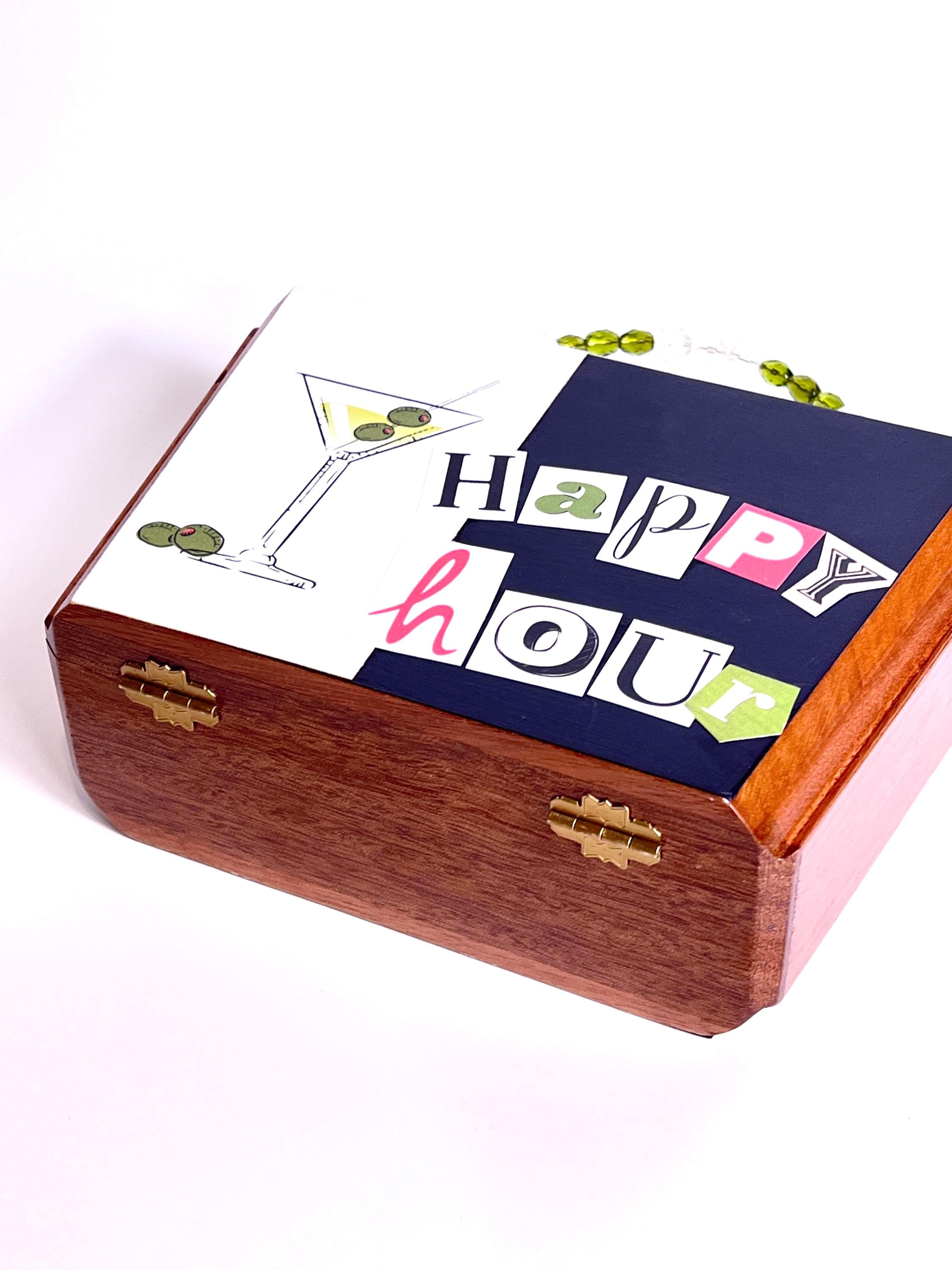 This fun & flirty purse features an image of a martini with olives & bold cut-out letters spelling "Happy Hour". Made from a beautiful and uniquely shaped recycled cigar box, this handbag is one of a kind! The black & white color scheme is accented with pops of red and olive green. The finishing touches are a crystal beaded handle and cork lining.