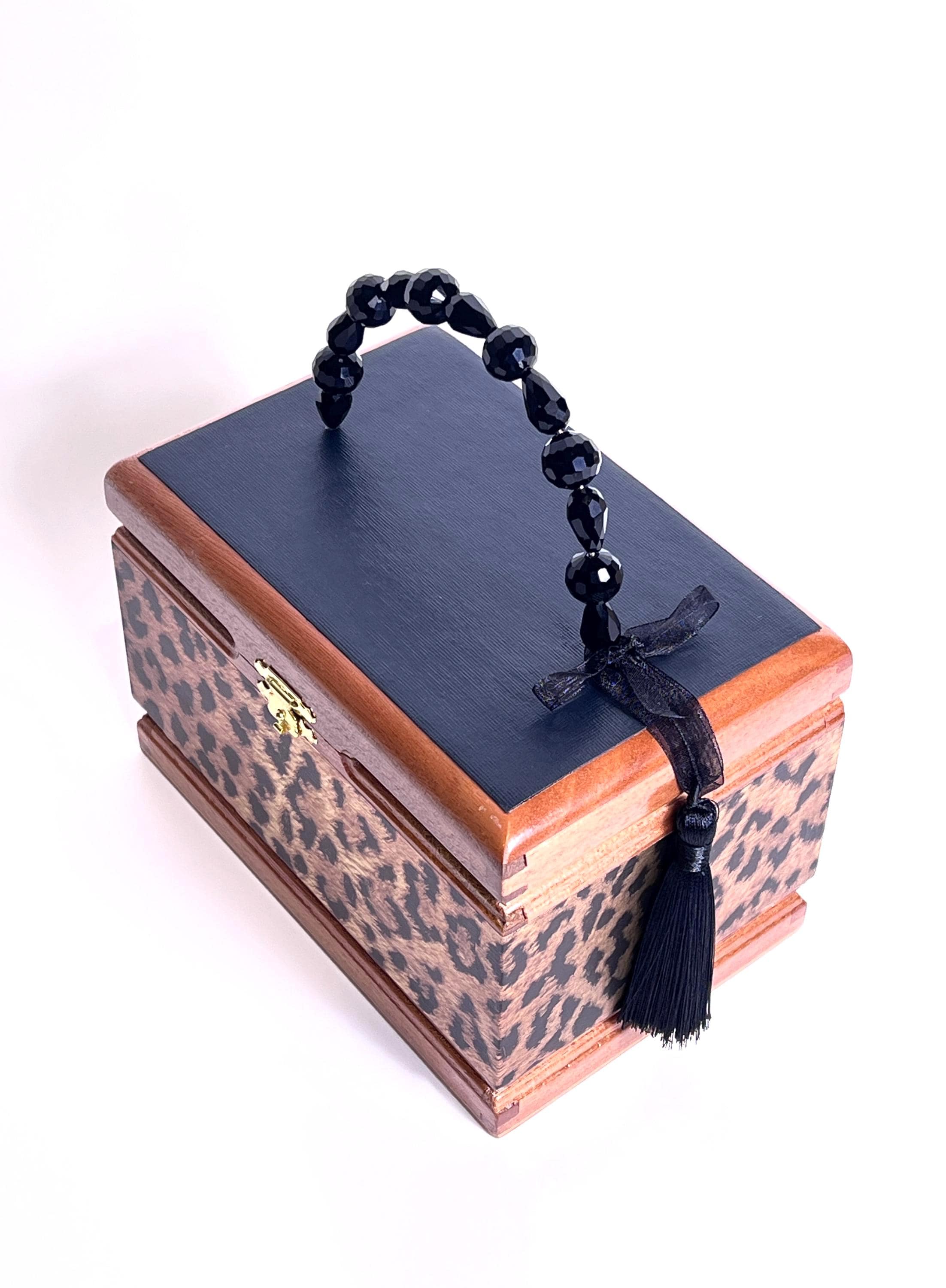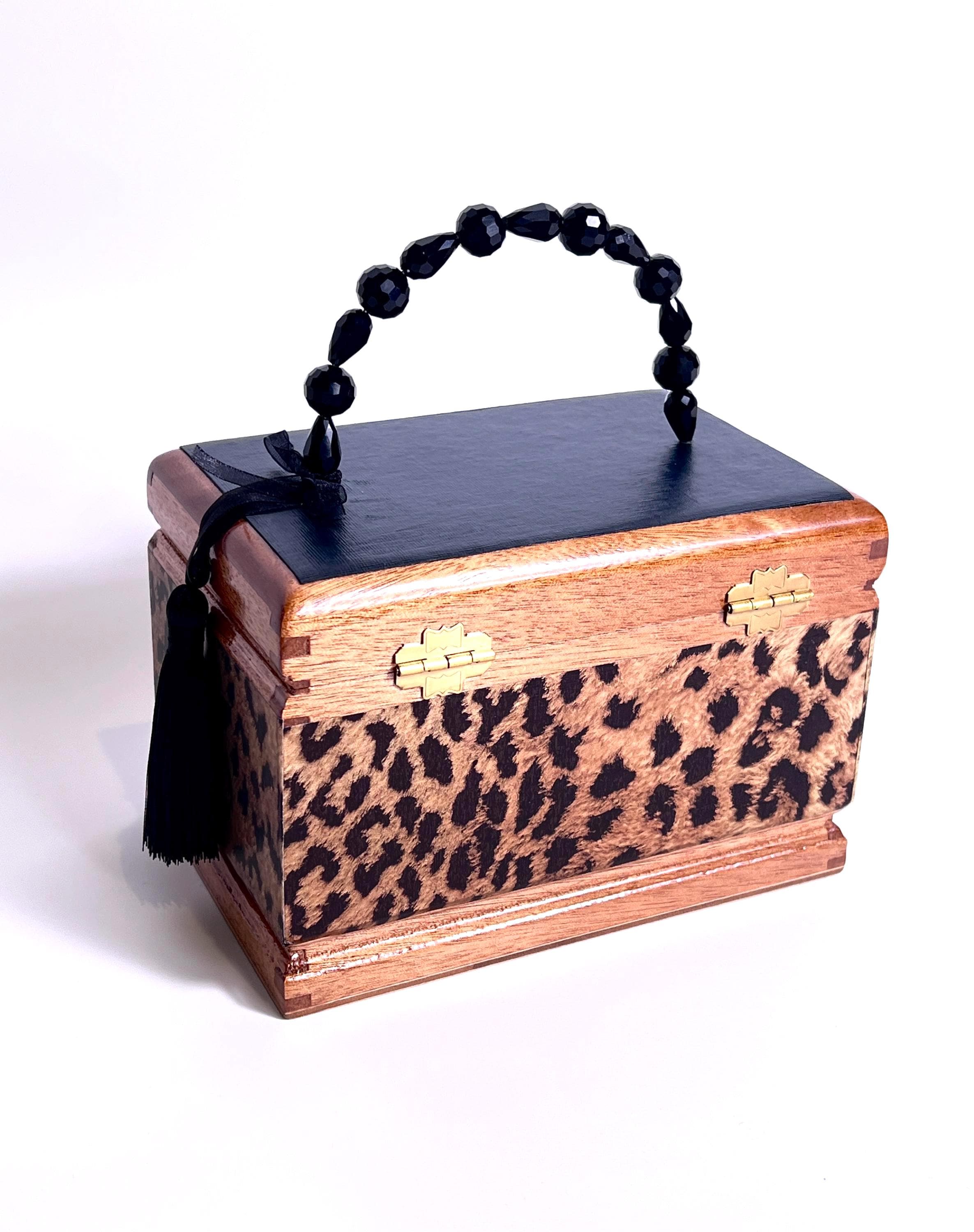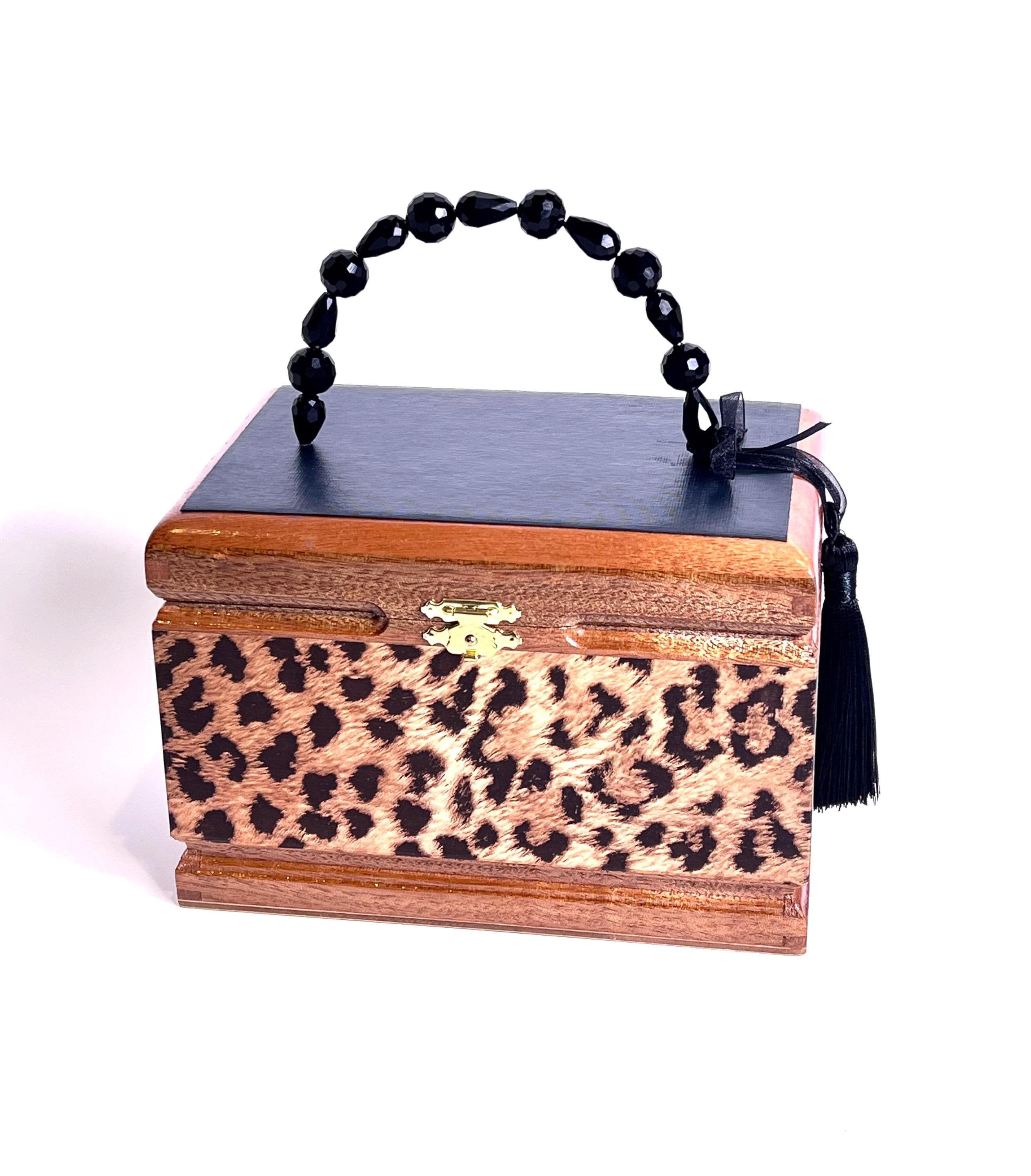Cheetah Print Cigar Box Purse, Gold & Black Animal Print Handbag with Beaded Handle, Sustainable Fashion