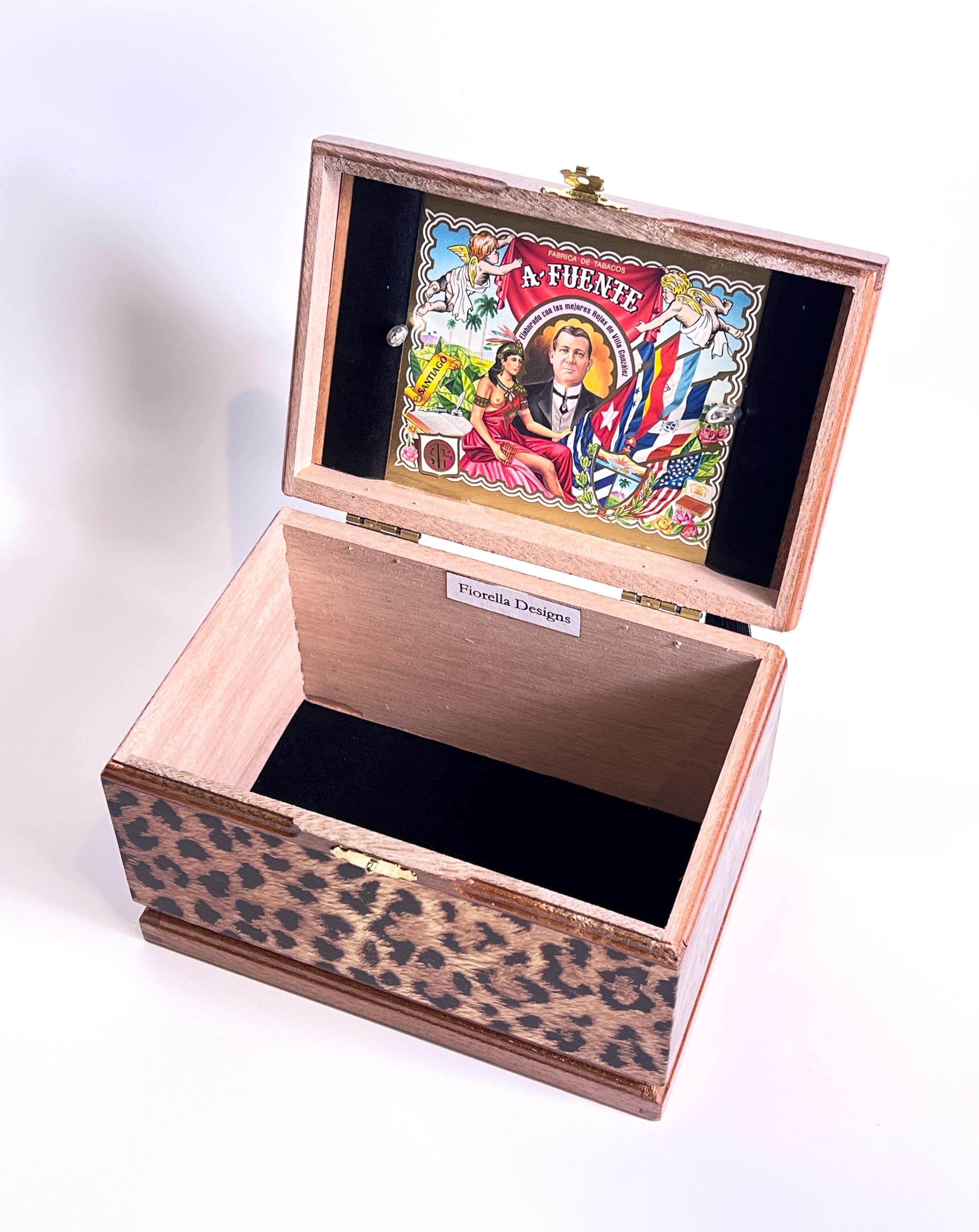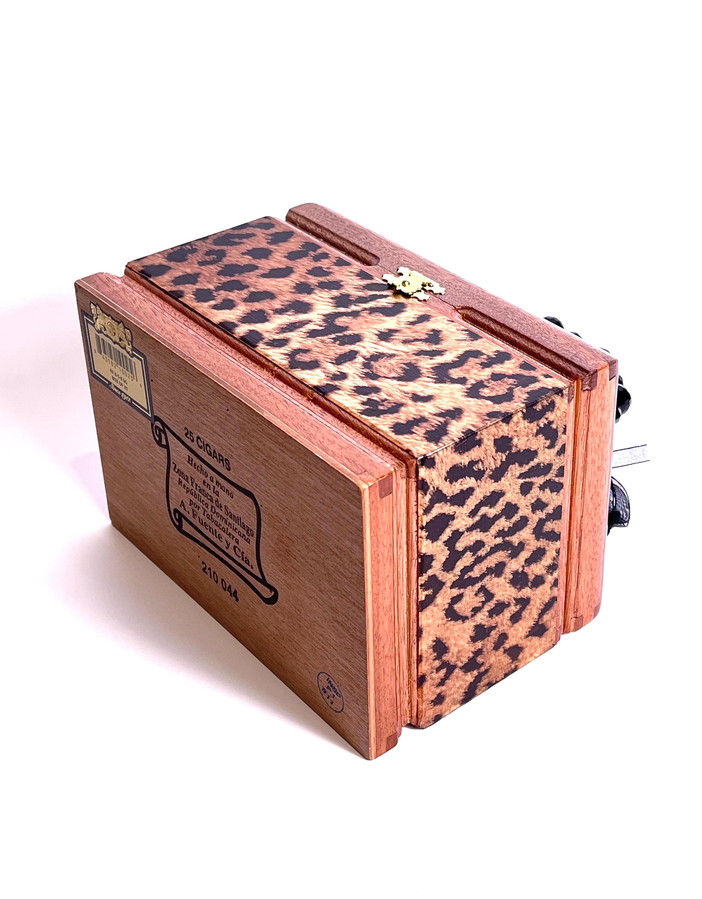 This upcycled purse features metallic cheetah print wrapped around the sides and solid black on the lid. The unique wood cigar box has a shape reminiscent of a treasure chest! The finishing touches are the black crystal beaded handle & tassel.