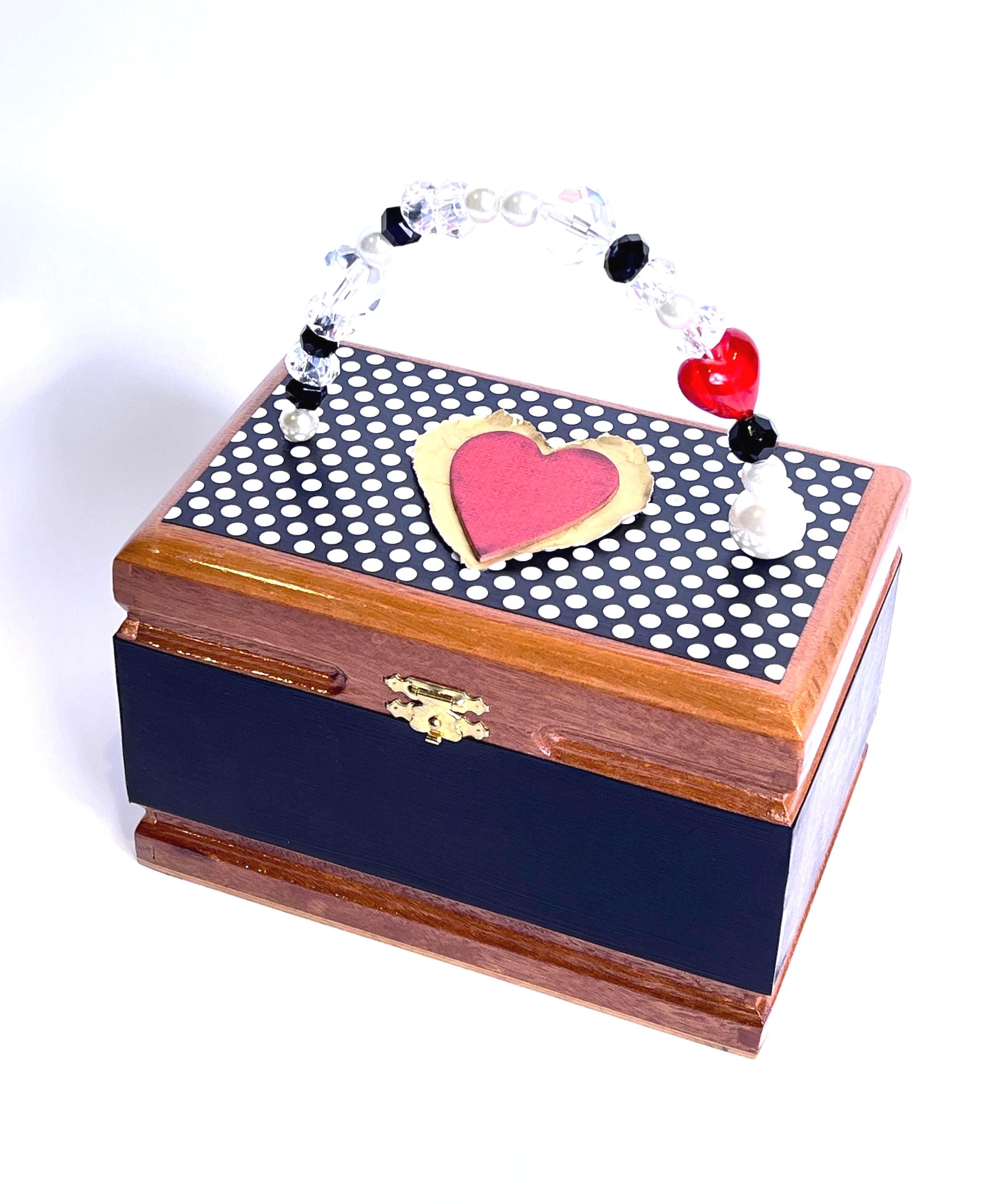 Queen of Hearts Cigar Box Handbag: Red Heart Embellished, Black & White Polka Dots, Beaded Handle