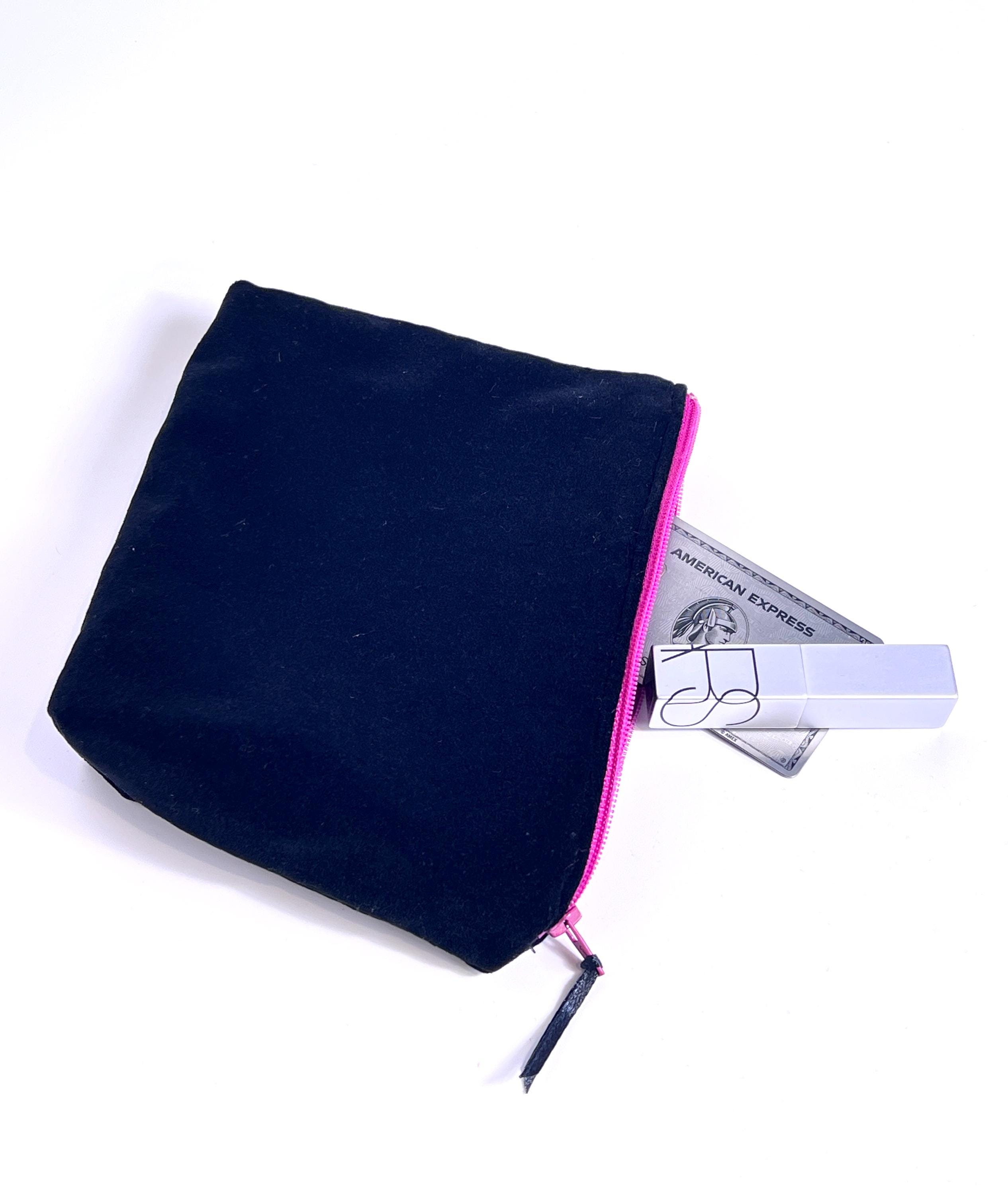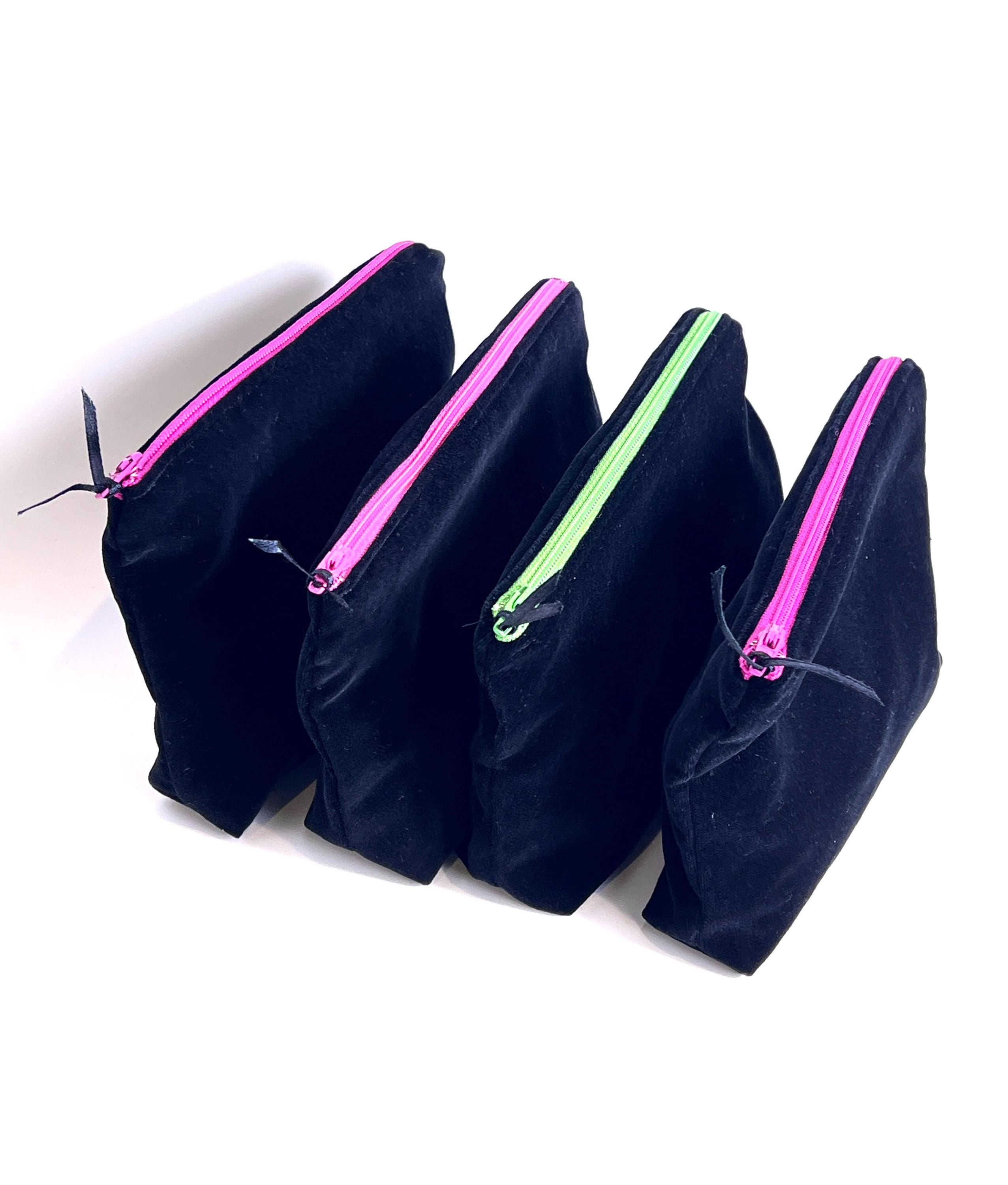 This multi-use zippered bag is designed to fit inside many of my cigar box purses and is perfect for keeping your items secure. Handmade of a super soft, washable black velvet fabric, the pouch is practical and pretty! Choose from bright pink or lime green zipper colors for a fun pop of color. Use for organizing makeup, tech accessories, travel needs and more.