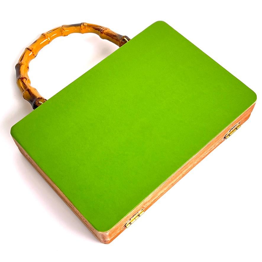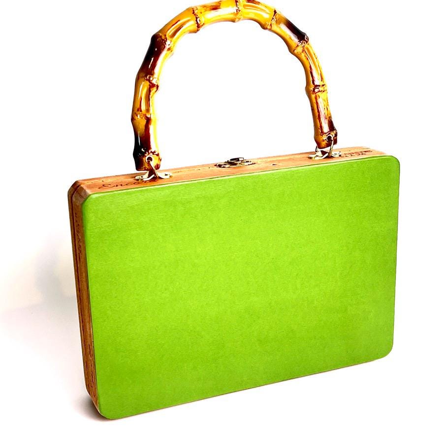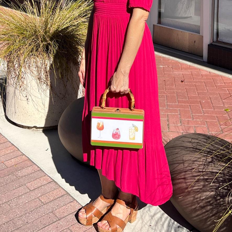 This bold & bright handbag features 3 summer cocktails with accents of orange, strawberry and lemon. The upcycled wood cigar box has been decoupaged with colorful green, pink & orange paper, and sealed with a matte finish. The faux bamboo handle completes the tropical resort vibe. Carry to a garden party, on vacation or happy hour and make a statement!