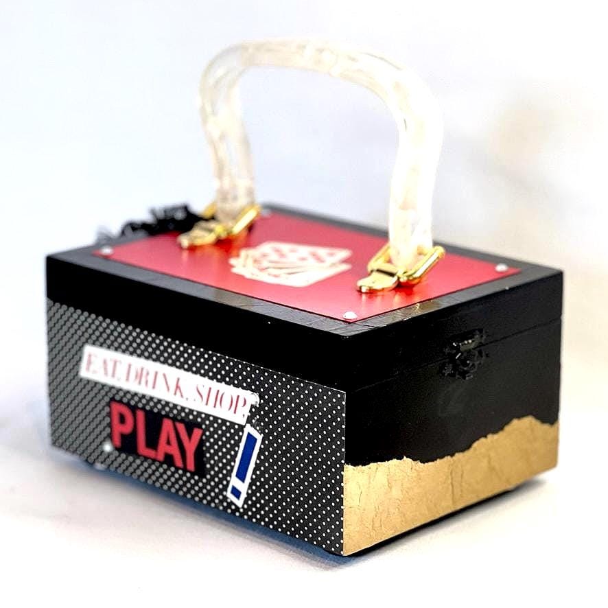 Crafted from a recycled wood cigar box, this purse is embellished with a Las Vegas motif. The top features mini playing cards fanned out in a royal flush on a red background. Bold magazine cut-out letters are layered on black and white polka dots on the sides. The glossy black finish and rhinestone details make this a glam accessory for that Vegas outfit! Now on sale!