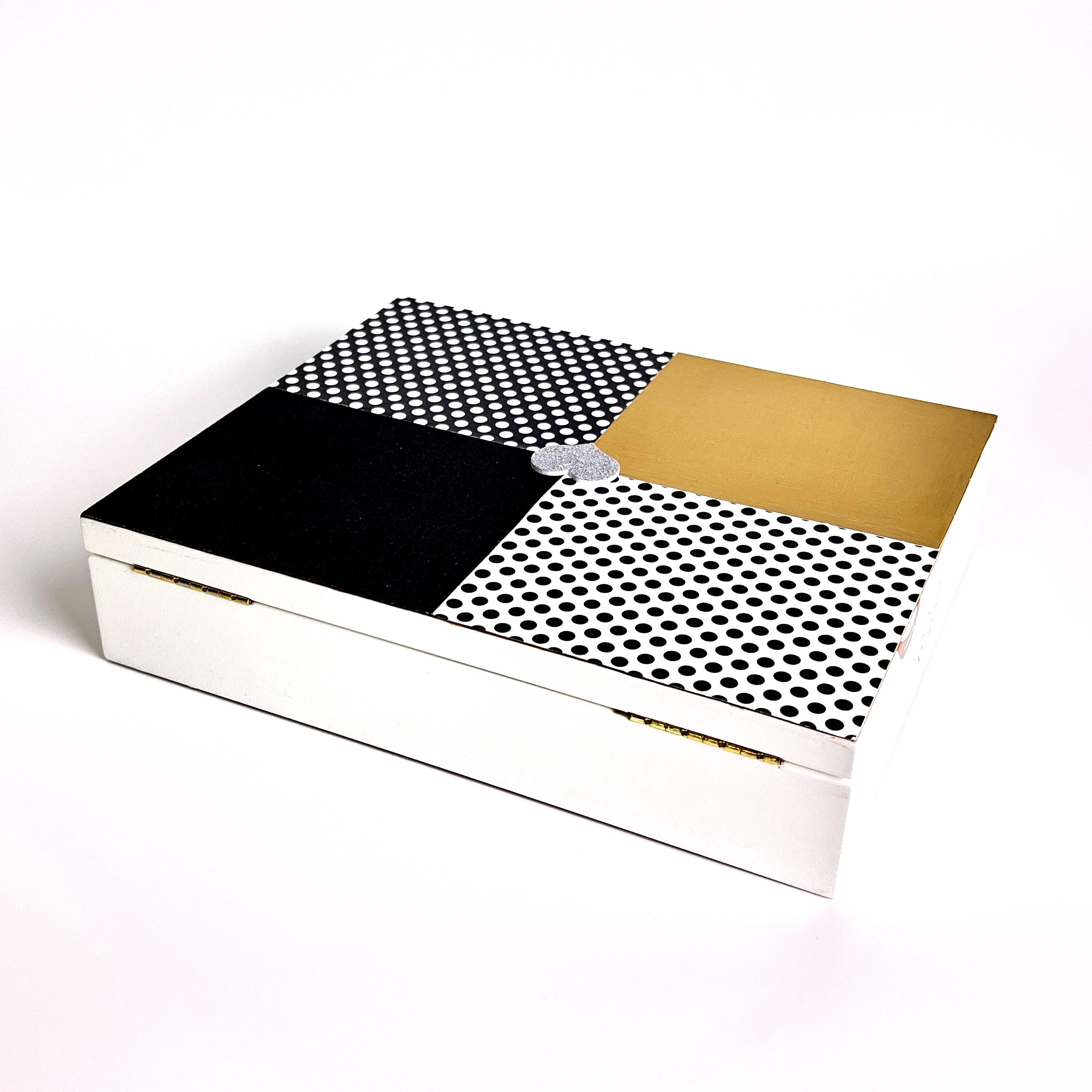 Inspired by Kate Spade’s designs, this white wood cigar box has been embellished with a three dimensional silver glitter heart as the focal point. Four squares of textured and metallic paper are the background, including black and white polka dots, gold and black glitter.