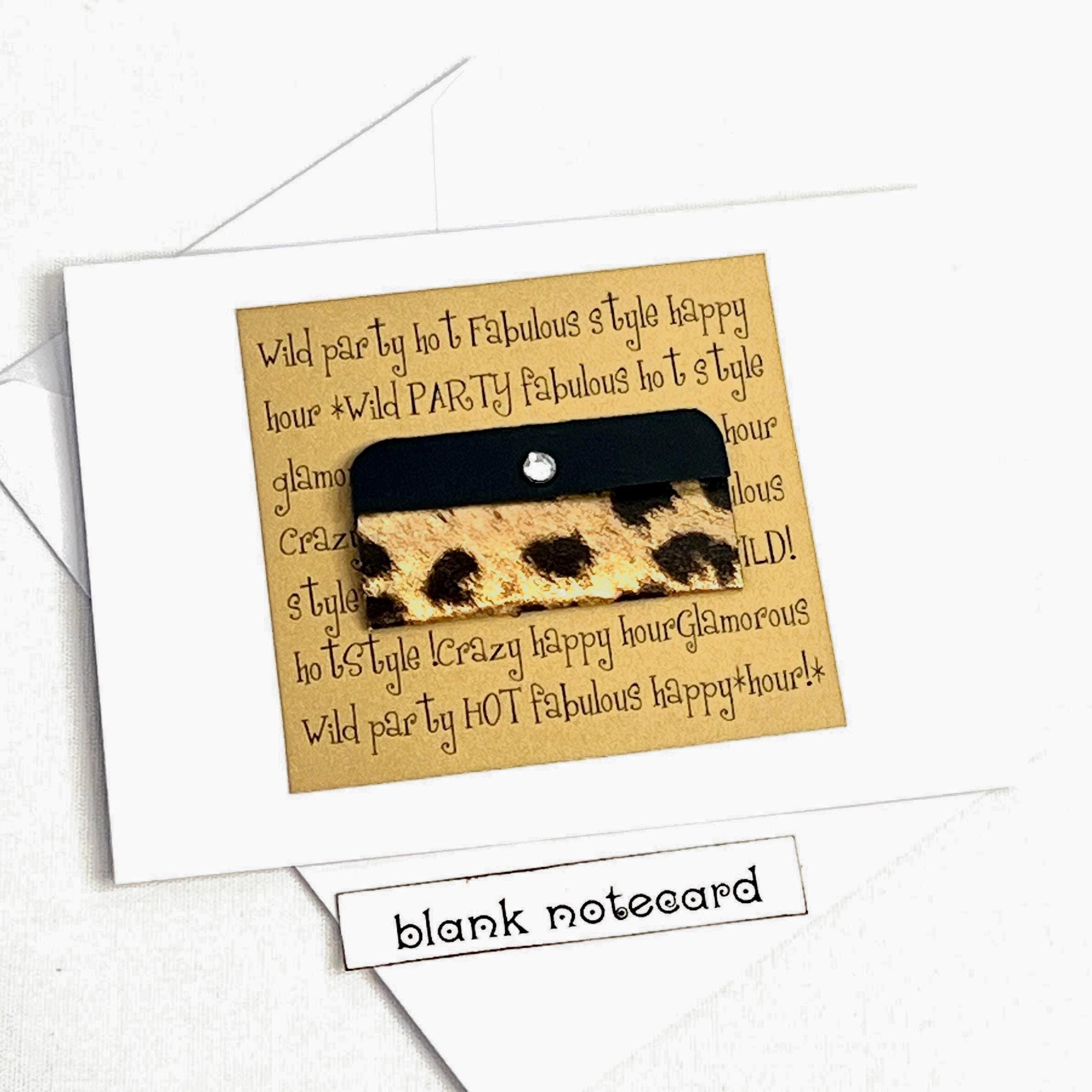 With a handmade mini clutch purse as the focal point, this embellished card is perfect for a fashionista! The gold and black cheetah print handbag is layered over a background of festive party words, like "wild, style, fabulous and happy hour". The glamorous three dimensional card is accented with a rhinestone.